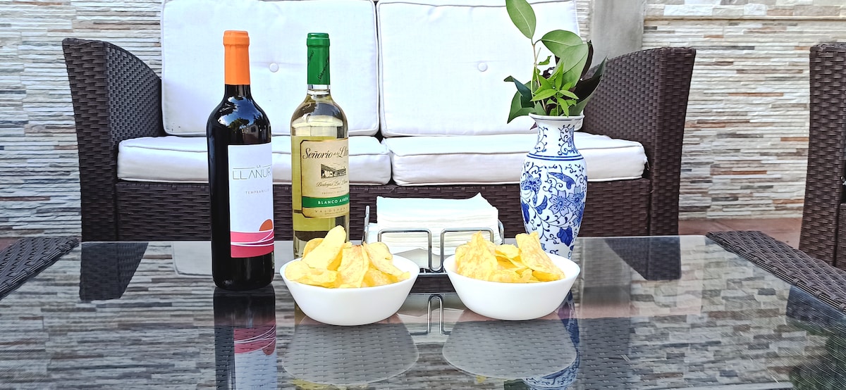 Coqueto Chalet totalmente equipado con salón-comedor abierto, cocina espaciosa, una habitación con cama de matrimonio y baño integrado, dos habitaciones con dos camas individuales cada una y baño completo independiente. Está a 15 min de Valencia.