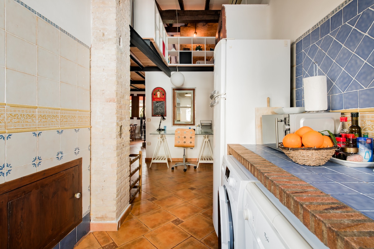 Loft located in the heart of the maritime district of Valencia, El Cabanyal, 5 min. from the Malvarosa beach. House built in 1900 and completely renovated without losing its essence. This stunning apartment fuses traditional architecture with chic boho design in a natural textured setting. Gaze at the high vaulted wood-beam ceilings and exposed brick walls as you dine in the marble kitchen area and cool off in the spacious rain shower.