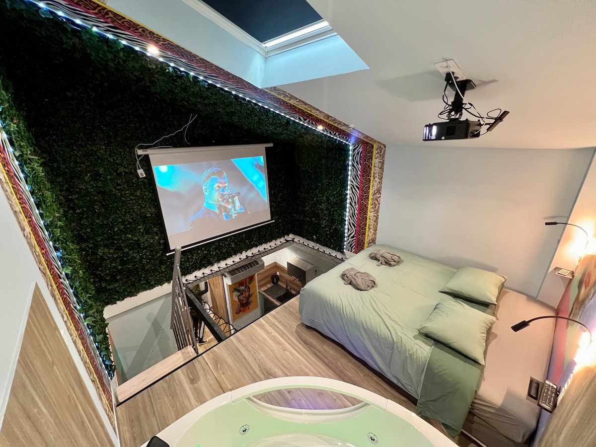 Profitez d'un séjour romantique unique dans une suite de luxe avec écran géant et baignoire balnéo ! Nous vous accueillons dans une maison entièrement rénovée où tout a été pensé pour que vous puissiez profiter d'un moment hors du temps. Pour une nuit magique et romantique avec lit queen size, lumières tamisées, écran XXL, table de billard et bar à bonbons Parfait pour un séjour romantique !