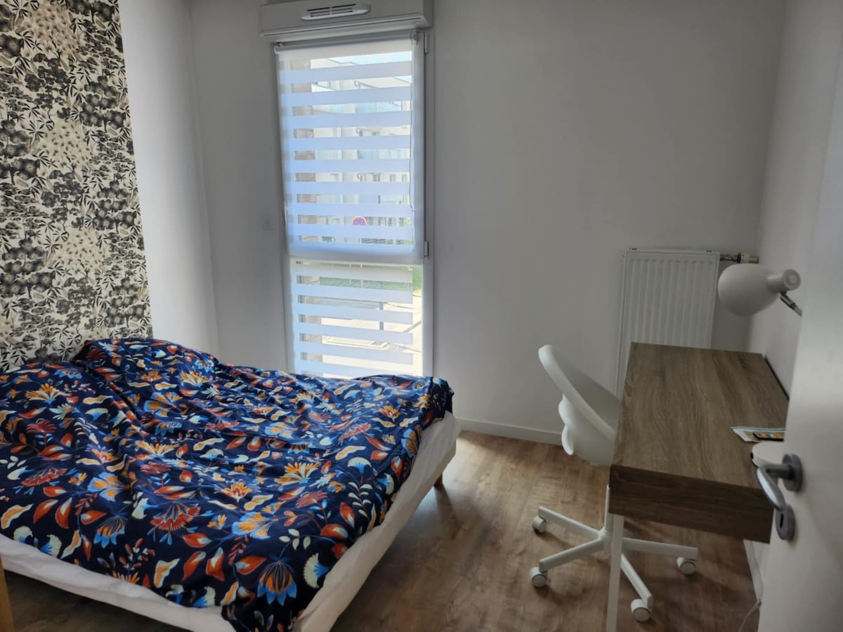 Grande maison moderne et spacieuse de 135m2 sur 2 étages , conçue pour le confort de 8 personnes sur plusieurs semaines 4 chambres ( 8 lits simples) 2 salles de bain 3 wc séparés cuisine équipée ouverte sur un espace repas pour 8 personnes terrasse extérieure avec table et transats . Wifi gratuit Lave vaisselle, lave linge et sèche linge dans le logement Stationnement gratuit dans la rue Proche tramway et gare 15 min à pied du centre ville À 5 minutes de l’autoroute