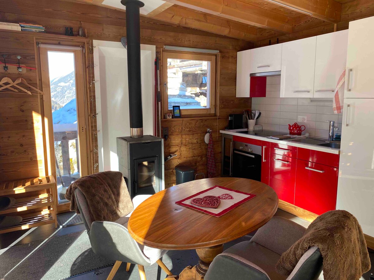 Alps Mountains. Italy. Aosta Valley. A cabin in a small village at 1600 meters,in the peace of meadows, grazing cows and mountains. Snow (usually) in the winter. A place of the heart, lovingly restored preserving the ancient beams of the roof. A wonderful view from the large windows and a special tranquility for those in search of peace, warmth and relaxation. The furniture is very nice: wood above all, but also more lively colors, and modern comforts. Quiet excursions, both on snowshoes or ski.