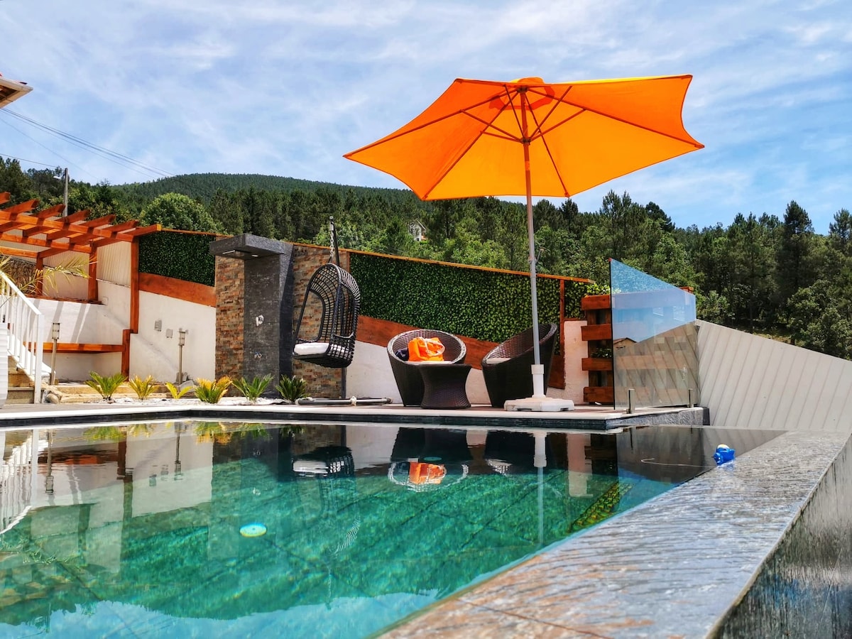 Nosso Chalé está inserido numa quinta vedada, com 3 hectares, situada dentro do Parque Natural da Serra da Estrela. Sitio calmo e tranquilo onde se pode apreciar a natureza e observar a fauna local, através de passeios pelo pinhal, ou optar seguir a ribeira até sua nascente. Também pode relaxar na nossa piscina. Ideal para descansar com a família ou amigos. Aceitamos todos os animais. A quinta, o Chalé, o jardim e a piscina são para uso exclusivo dos hóspedes.
