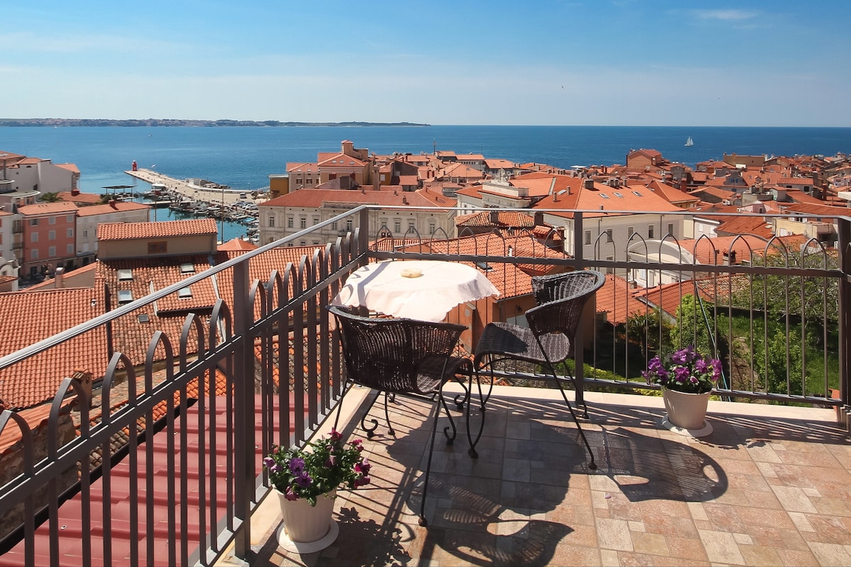The location of the property has an exceptional position with the terrace on the roof. On the balcony of rising and setting sun, you could admire an infinte 360° view of outstanding beauty over Piran and sea. It has open wide space with kitchen, a living room with sofa, a bedroom with comfortable double bed, a bathroom with a shower – bath and toilet. It is a romatic ambient, stylishly decorated, an ideal choice for two persons in love. It makes a feeling of spaciousness and brightness.