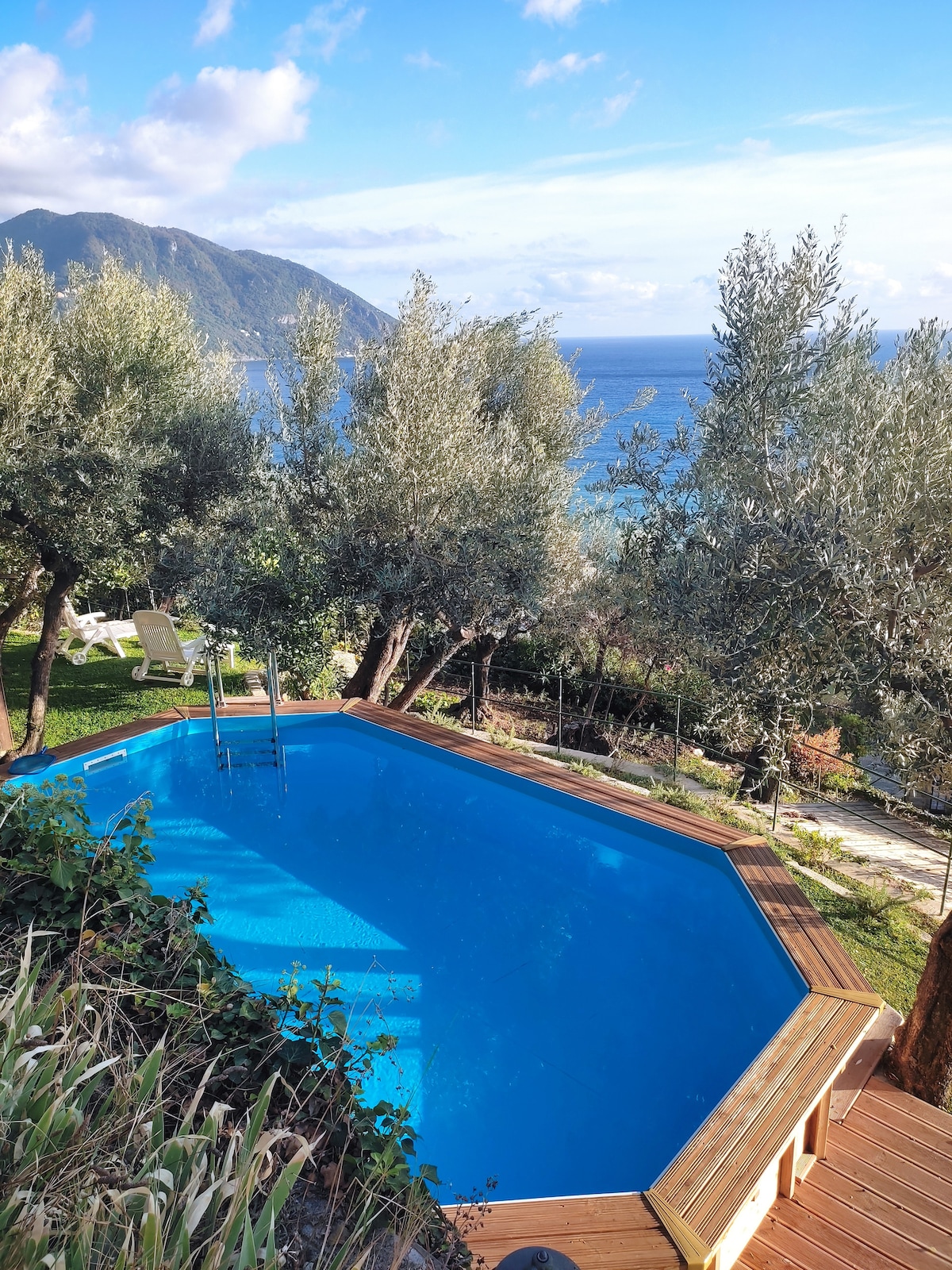 La casa è totalmente indipendente, immersa nel verde dell'uliveto ligure, con una vista mozzafiato sul Golfo Paradiso. Il panorama fruibile dalle terrazze e dalle finestre si apre dall'estremo ponente ligure al Monte di Portofino e nelle giornate limpide fino all'arcipelago toscano e la Corsica. Il mare (500 m.) Recco(1200 m.) il Parco Nazionale di Portofino(3km) sono raggiungibili oltre che in auto, anche a piedi con panoramiche passeggiate; Genova-Nervi dista 12 km (SS1 Aurelia)