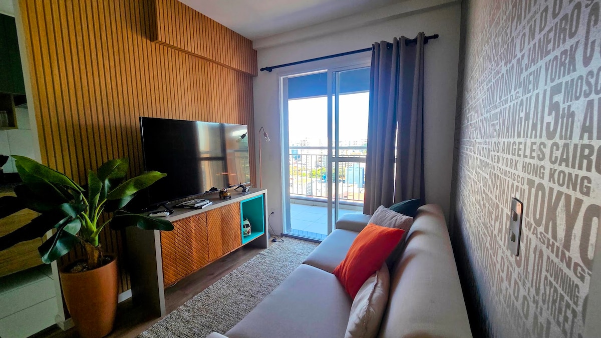 Apartamento aconchegante, moderno e bem equipado. Ideal p/ 2 adultos. Excelente estrutura, piscina e academia incríveis. Localização é um diferencial. Roupa de cama, mesa e banho de qualidade. Travesseiros e mantas são fornecidos para maior conforto. Cozinha completa: geladeira, cooktop, microondas, liquidificador, panelas e demais utensílios. Máquina de lavar e ferro. Internet de potente. Garagem para 01 automóvel disponível, sem custo adicional.