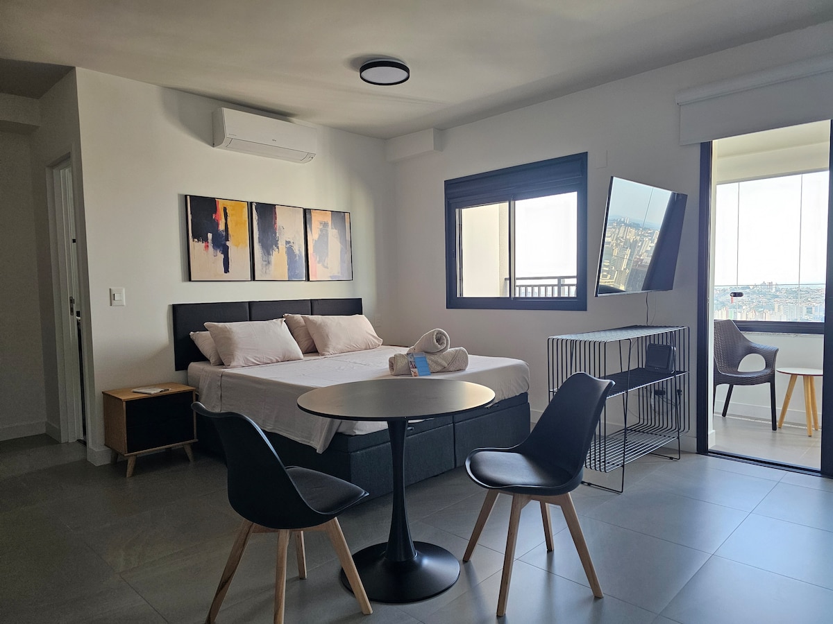 Viva uma experiência de conforto e praticidade! Preparamos um apê moderno, mobiliado com muito carinho para sua estadia. Você vai se sentir em casa! Ambiente aconchegante com: Cozinha completa, varanda ensolarada, cama de casal com closet, Smart TV, Wi-Fi, ar-condic e roupas de cama/banho novinhas e macias! E mais: além de um studio charmoso e lazer no condomínio, você estará em uma localização privilegiada,perto do Bosque dos Jequitibás, Av. Norte-Sul e Cambuí, com ótimos restaurantes e cafés.