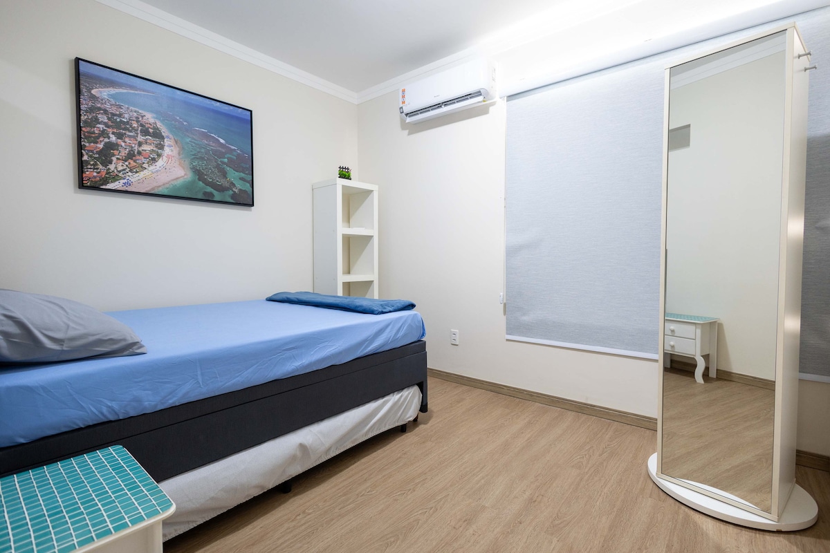 As acomodações são uma cama Queen no dormitório e um sofá-cama, todos muito confortáveis, com roupas de cama e toalhas limpas. Equipado com cortina black-out, guarda-roupas moderno, gavetas livres. Além disso, o apartamento conta com uma máquina de lavar roupas compartilhada ( lavanderia OMO) , TV ultima geração, Tomadas USB e Wi-fi 240MB O prédio é novo , mas conta com 4 elevadores, estacionamento e portaria 24 horas. Acesso do hóspede