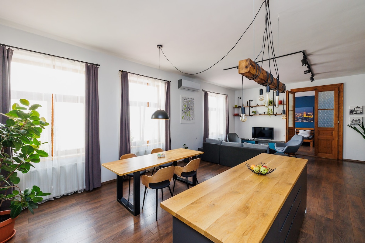 Hello future guests! Welcome to Downtown Memo, a spacious two-bedroom + living room apartment in central Cluj-Napoca, great for families or work trips. It’s on the second floor of a historic building with high ceilings (no elevator). The 107 sqm (1150 sqft) flat is quiet thanks to its courtyard location. You’re steps away from the main square, central park, museums, cafés, restaurants, bars, shops, and the bus station. Get ready for a comfy, peaceful stay right in the heart of the city!