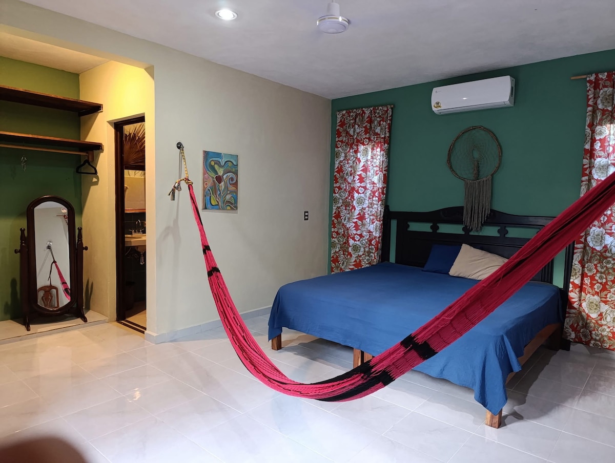 Disfruta de la sencillez de este alojamiento tranquilo y céntrico en el centro de valladolid a solo unas cuadras de la plaza. la habitación incluye una cama tamaño matrimonial, ventilador de techo, aire acondicionado, wifi y baño privado dentro de la habitación. El Cenote Zaci se encuentra a 100 metros y el mercado municipal muy cerca, hay tiendas, farmacias, lavanderias, cafeterias y lugares para comer y otros servicios a sus alrededores, se puede llegar a pie desde la estacion de buses o taxi