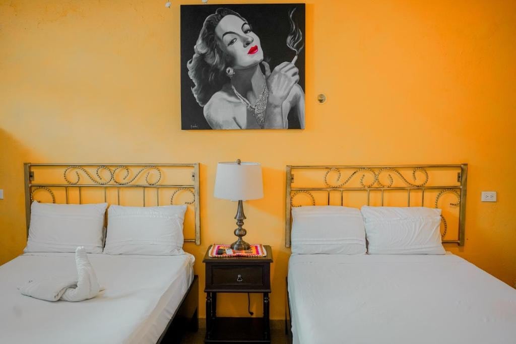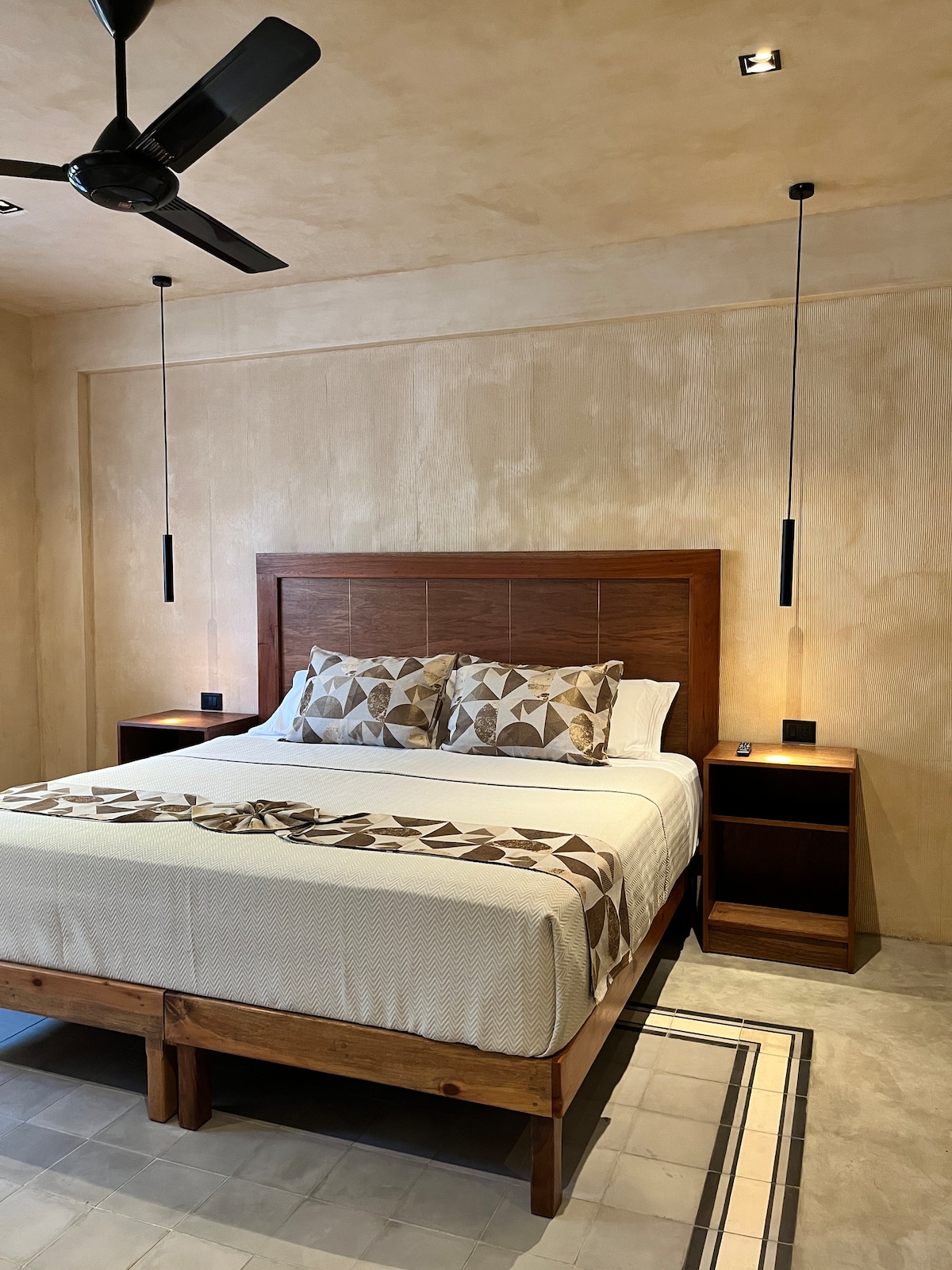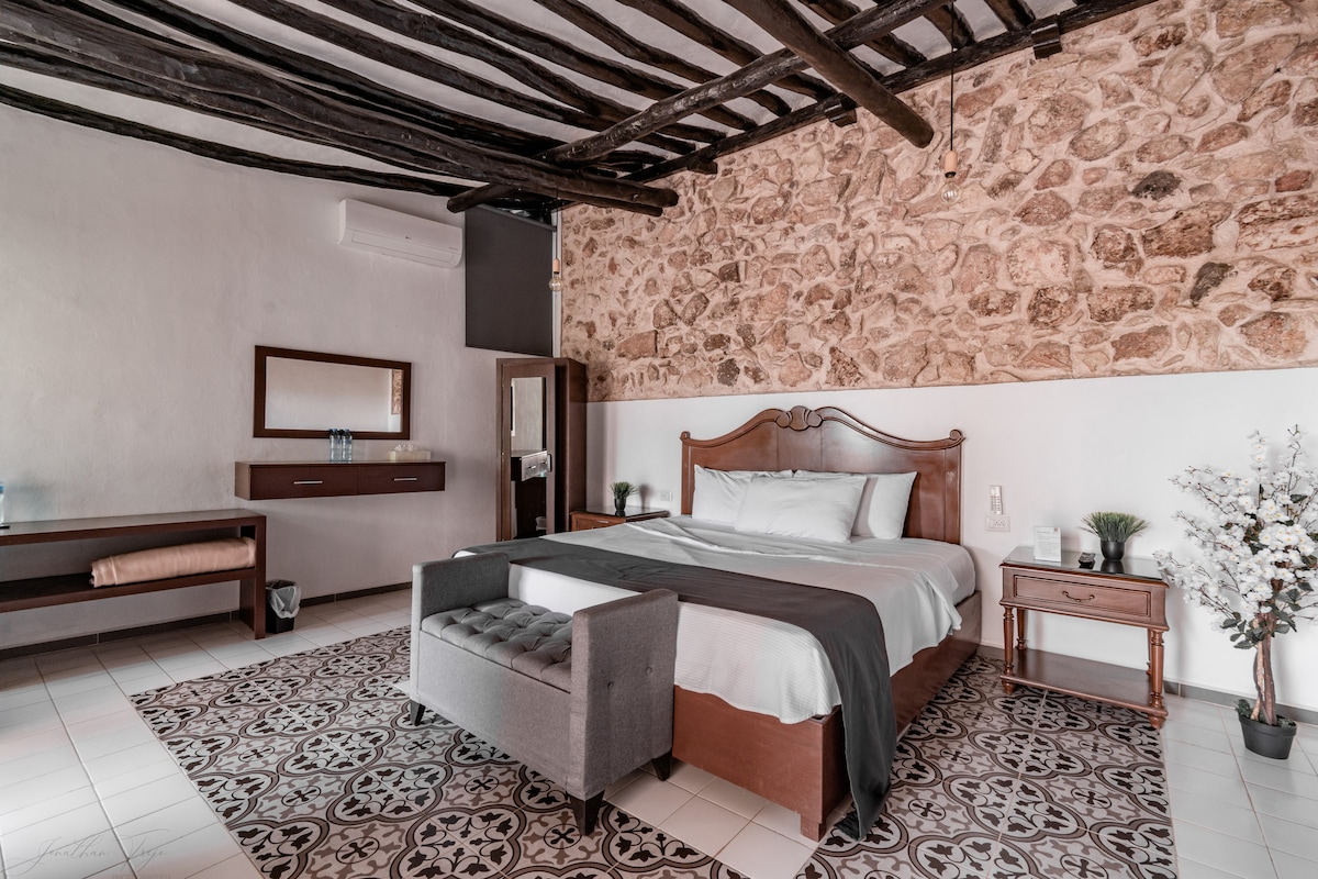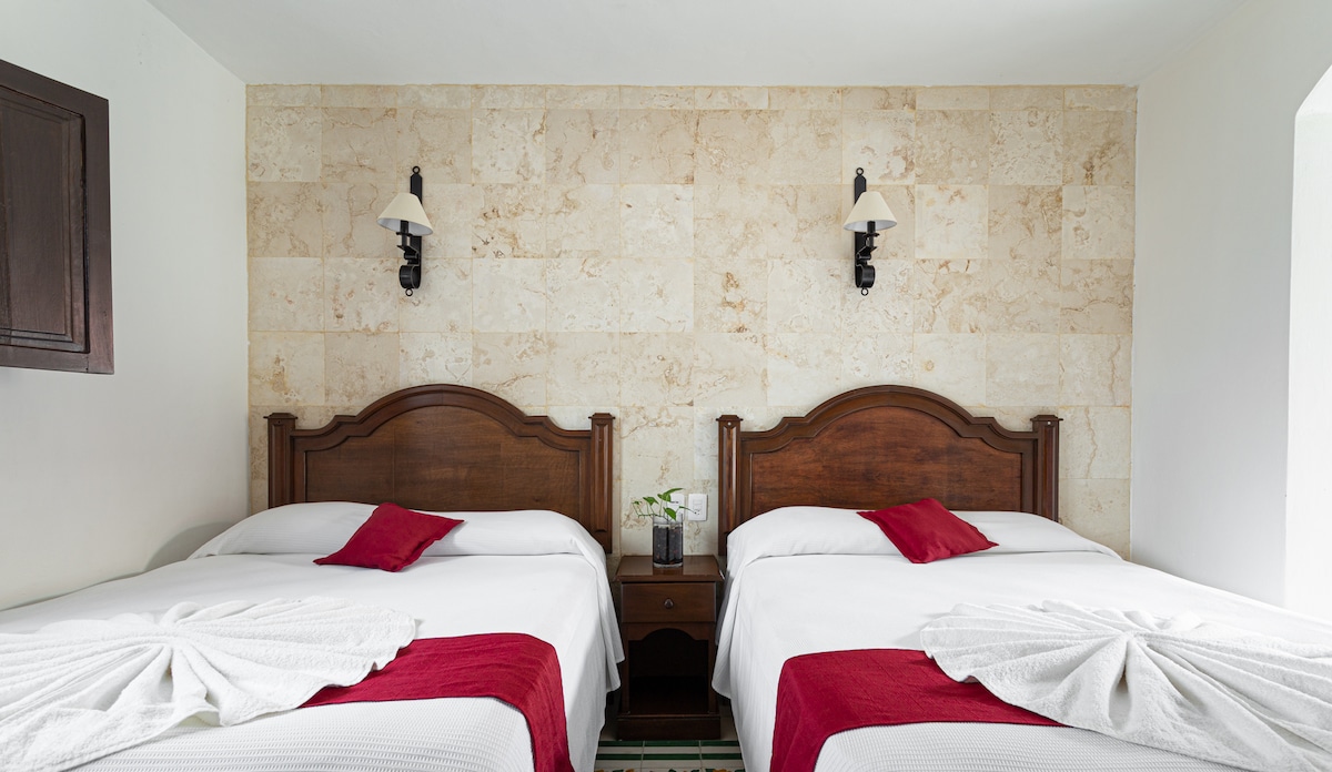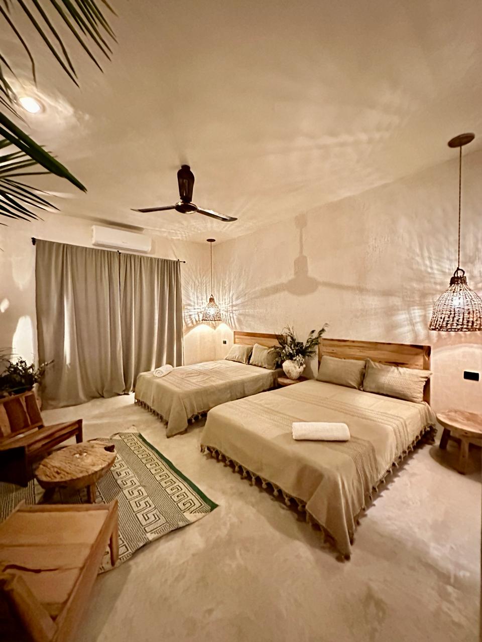 Amplias y cómodas para vivir una experiencia “KIIN WAYEB” Nuestras habitaciones más exclusivas están diseñadas para ofrecerte una experiencia inolvidable, donde el confort y el lujo se fusionan con el encanto de la cultura yucateca. Estas habitaciones están equipadas con dos cómodas camas matrimoniales, donde podrás descansar y despertar renovado, escritorio, Smart TV, Aire Acondicionado, Agua Caliente y una Hamaca para descansar por las tardes al clásico estilo yucateco.