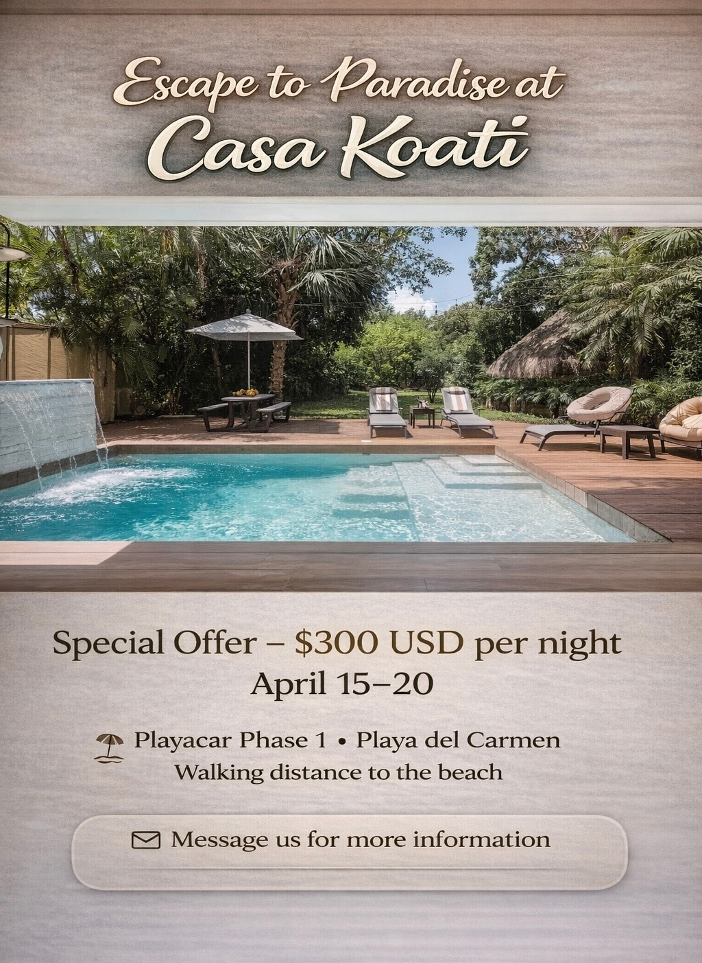 Casa Koati is a new house, with an unbeatable location; we are only 5 minutes walking from the beach and 5 minutes walking to the well known "5th Avenue" and the Mall "Paseos del Carmen" of Playa del Carmen. The house is located in the exclusive residential of Playacar Phase 1, having 24 hour security available and controlled access. The house is perfect for any type of group of 8 people, wether for a family with kids, a group of friends or couples.