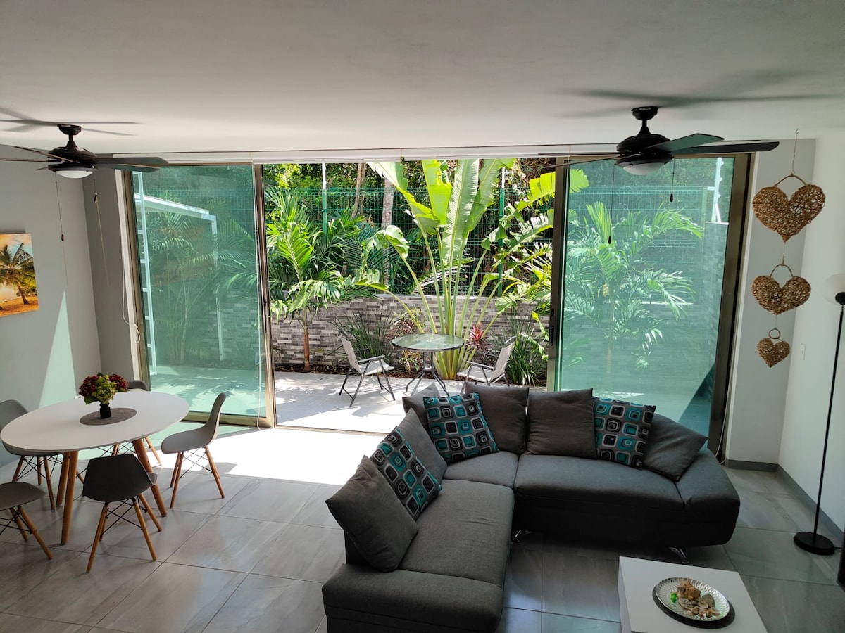 Large and beautiful studio bungalow, ideal for small families. Enjoy its charming balcony with hammocks surrounded by a tropical garden for a unique experience. It features two double beds, a private bathroom with eco-friendly amenities, daily cleaning, Wi-Fi, a shared pool with a jacuzzi, a safe, a minibar, cable TV, free covered parking, and 24-hour security with cameras. Enjoy a rooftop terrace with a beautiful partial ocean view. Bilingual reception. Pet-friendly.