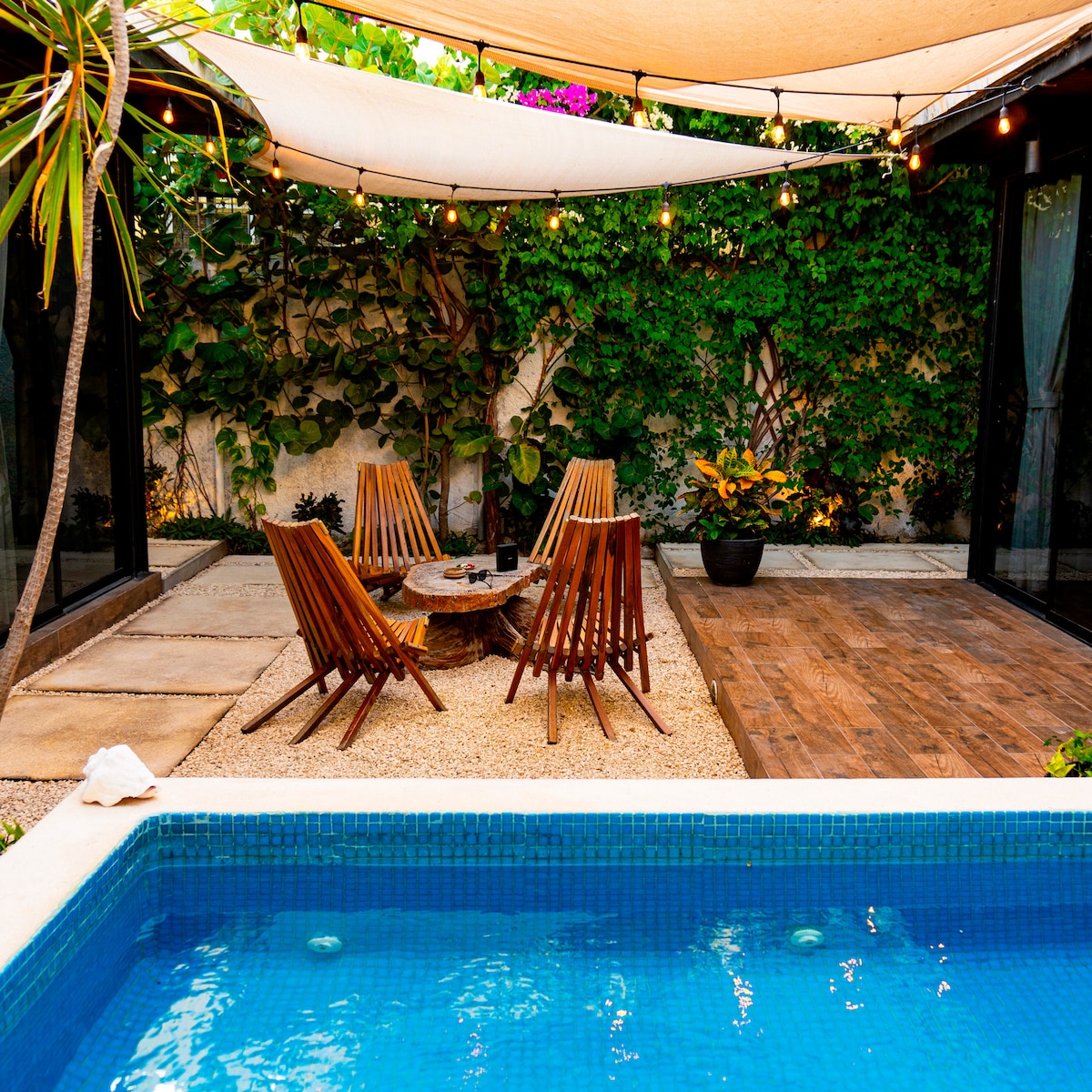 Amazing DEPARTAMENTO ZAMMA , con una vista soñada a su ALBERCA PRIVADA. Disfrutá de una cocina equipada, cama King Size, Smart TV, WiFi de 500 Mbps y una terraza con jacuzzi privado con vista a la naturaleza. Descansá en este entorno sereno, dentro del complejo CASA JUNGLA, ubicado en un fraccionamiento privado sobre la calle 38, a solo 2 cuadras de la 5ta Avenida, la playa, restaurantes y supermercados.