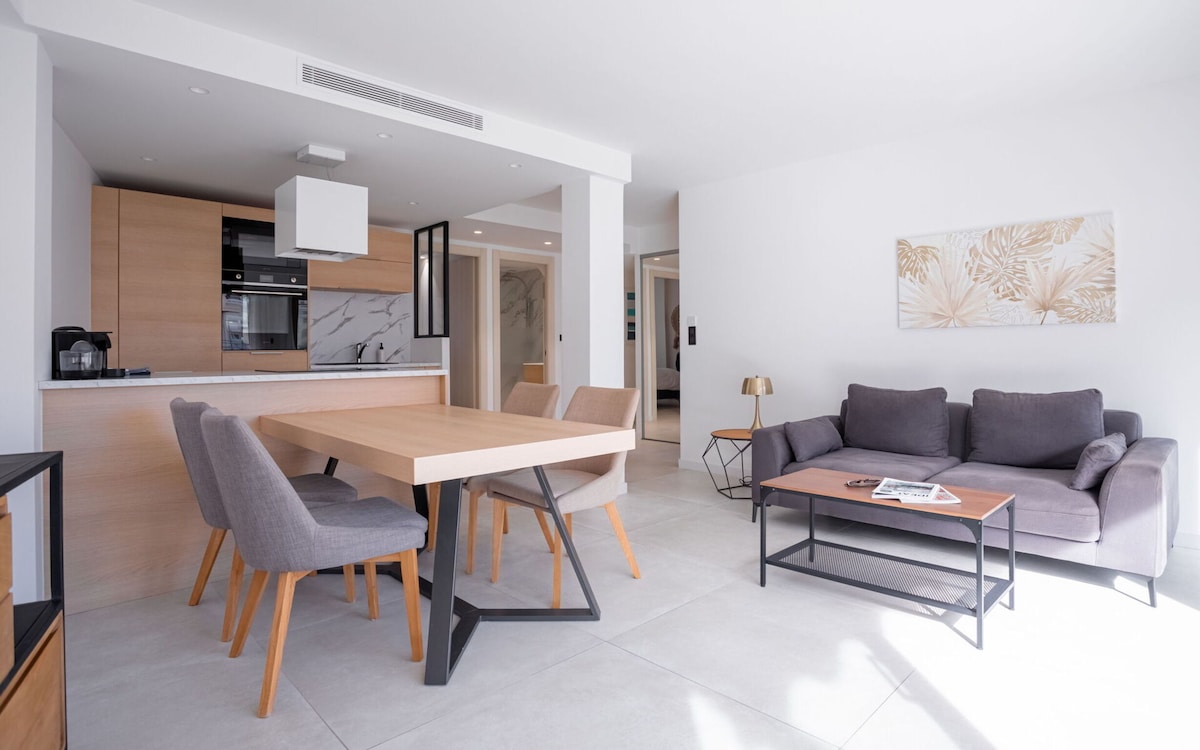 Beautiful apartment with panoramic sea view This stylish 5**** fully renovated 3 bedrooms apartment with air conditioning is ideal for delegates (14 mins walk from the Palais des Festivals) as well as for vacationers (5 minutes walk to the beach). What's nearby: The Plage du Midi district is a very pleasant tourist area in Cannes. It is located just after the old port, only a few steps away from the city center and the Palais des Festivals. There you will find public and private...
