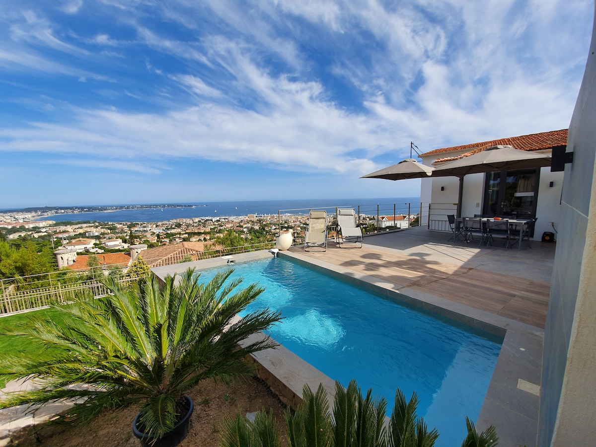 Située sur une colline résidentielle de Cannes/Vallauris, la villa est au fond d'une allée privée avec portail. Sur 1 800 m² de terrain en restanques, elle bénéficie de nombreuses terrasses. Elle est composée d'un séjour de 38 m², d'une cuisine ouverte, de quatre chambres (dont une suite parentale avec salle de bain) et de deux salles de douche à l'italienne. La piscine de 11m sur 4m est chauffée et à débordement. La maison et la piscine bénéficient d'une vue dégagée avec un aperçu mer.