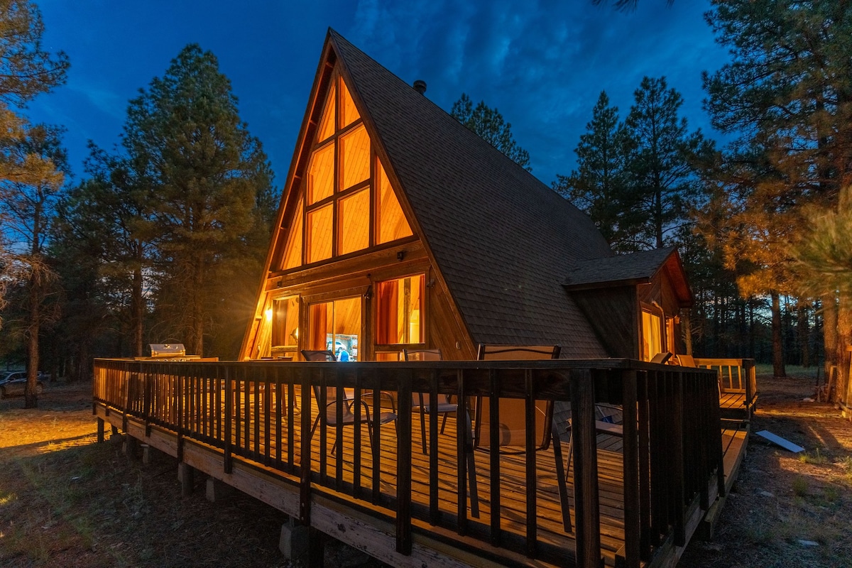 Welcome to your home away from home! Our comfortable and peaceful 10 acre stargazing A-Frame is unlike any other rental and just 25 minutes from the Grand Canyon. The A-Frame offers: -25 min to the Grand Canyon. -35 min to downtown Williams. -10ft tall window with incredible views. -Propane grill, cooler, and fire pit for outdoor fun. -Indoor heating providing cozy temps year-round. -1 queen bed and 2 fold-out single floor mattresses (ideal for kids available upon request).