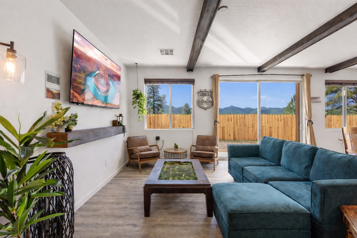 Unwind, Relax, and Recharge — Your Perfect Retreat Near the Grand Canyon → Majestic mountain views of Humphreys Peak (Arizona's tallest mountain) → Breath taking stargazing views → WiFi → Smokeless firepit → Hot running water → Pull out couch → Fully fenced backyard for kids or pets safely to roam → Nespresso coffee → Heater → Mini Fridge → BBQ grille → 4ft Jenga & multiple board games → 25 minutes away from the Grand Canyon → 45 minutes away from Snowbowl → 30 minutes away from Bearizona