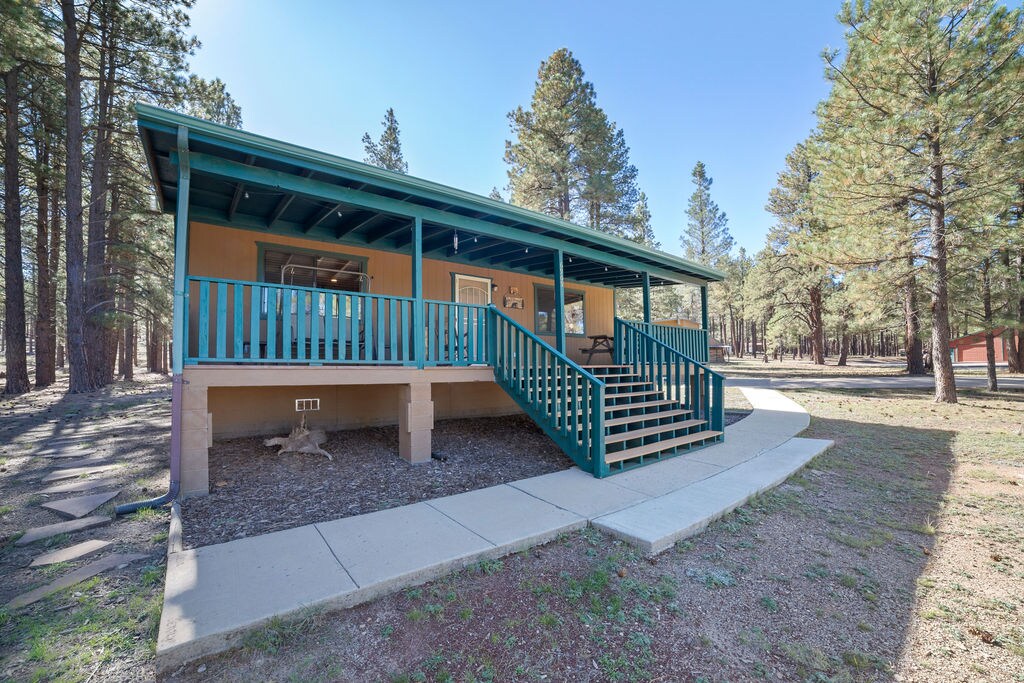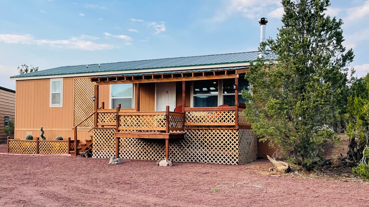 Off Grid with self-check-in, 900+ sqft Manufactured home solar powered, private lot, good for star gazing, close to Grand Canyon National Park South Rim, local maps and guides, great view of San Francisco Peaks, front porch and back patio, animal friendly, fenced yard, kitchen, living room, bathroom. Fireplace & propane heaters are the main source for heat. I recommend a high clearance vehicle, but it is not necessary. No irons or hair driers, limited power and water available. wi/fi STR-24-061