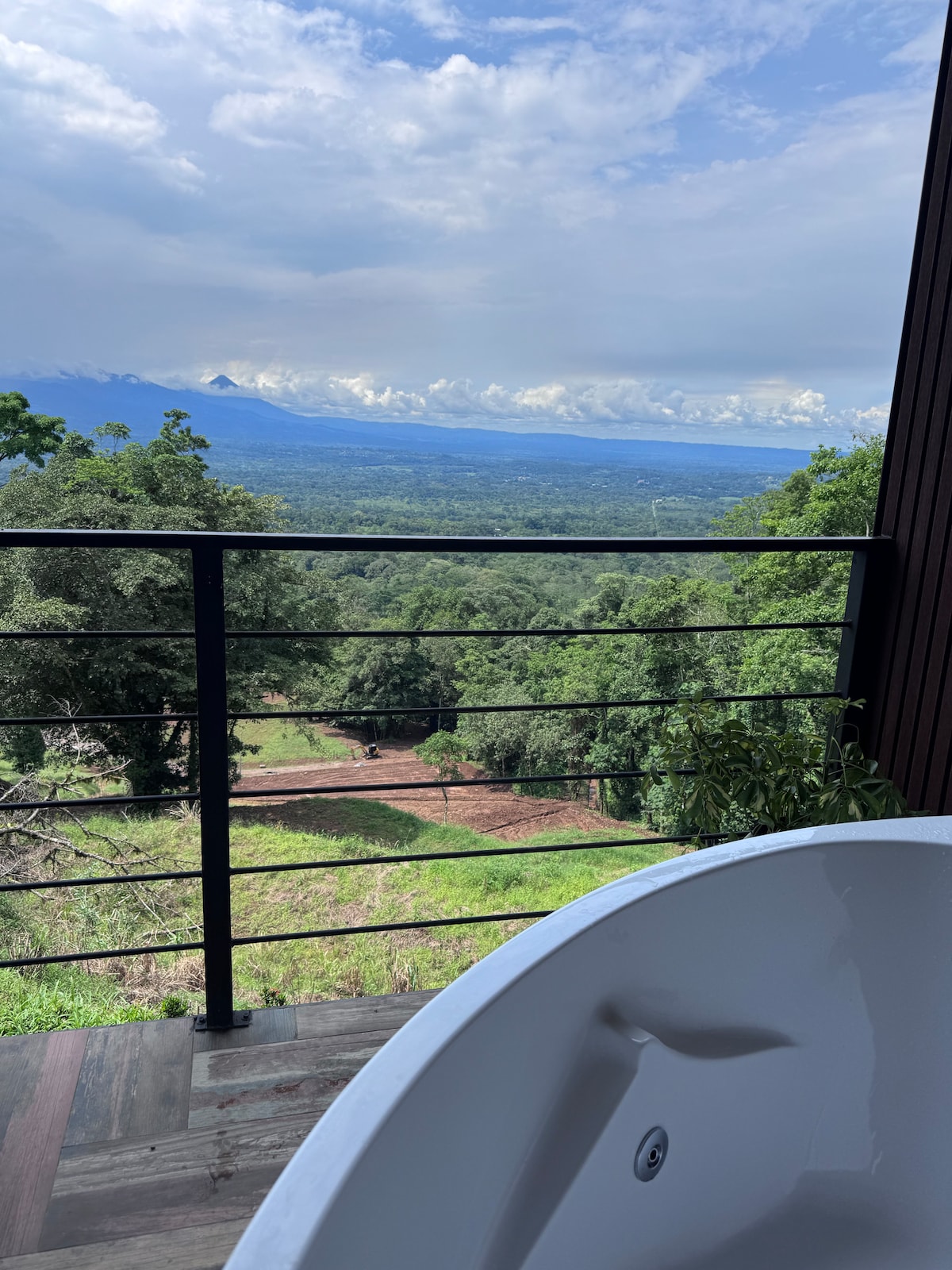 Rodeado de los colibríes y su sonido. Combinamos comodida y naturaleza en un entorno espectacular. La joya del lugar es, sin duda, su vista panorámica, desde su balcón privado se puede admirar el volcán que domina el horizonte, así como el hermoso valle que en la noche se ve bañado por las luces de la ciudad. La experiencia nocturna es encantadora con la fogata que da calidez y crea una atmósfera acogedora y romántica así como su cama flotante en la cual puedes disfrutar de una noche estrellada.