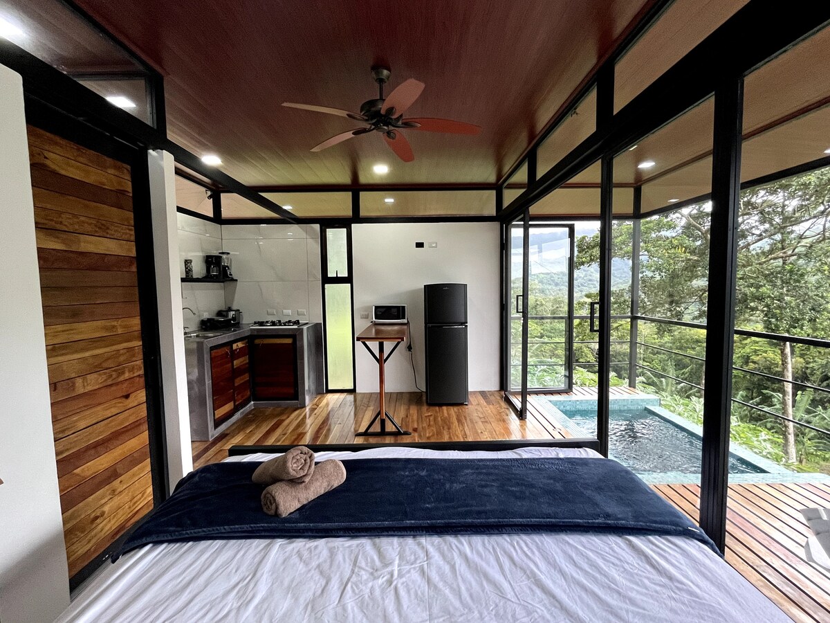 Specially designed to coddle our Airbnb users by providing them luxurious and functional spaces and a touch of immersion in nature that will fill that need for peace and relaxation. Strategically located just 5 minutes away from downtown La Fortuna, this apartment has an indoor private plunge pool/jacuzzi, beautiful views of the Arenal Volcano from its balcony and kitchen, A/C in the room, as well as a bathroom with an open shower with glass roof.