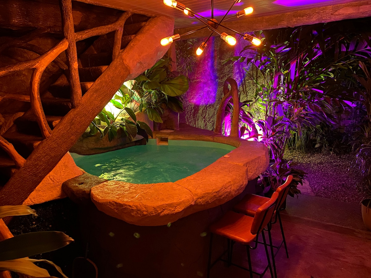 This new romantic, luxurious and wellness villa offer you the best sensorial experience. With an amazing jacuzzi immersed in a tropical garden. This Villa is located just 3 blocks from the center of Fortuna and at the same time, away from the noisy streets. 100% equipped with: cooking area, 300Mbps fiber internet, big king bed, air conditioning, 55'' smart tv, unique bathroom surrounded by exuberant nature. A lower terrace and an upper terrace with the best panoramic view of the arenal volcano.