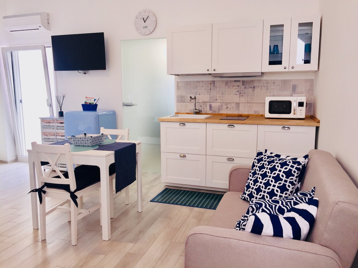 Nuovissimo appartamento a soli 150m dal corso pedonale di Peschici, con una superficie di 48 mq e uno splendido balcone con vista mare e scorcio sulla baia. Luminosa e arredata con gusto munita di ogni comfort, climatizzatore, rete wifi, televisore 50 pollici, cucina attrezzata con frigo, freezer, forno, macchina per caffè espresso, bollittore elettrico e tostapane, zona pranzo. Non manca una vasca idromassaggio (disponibile a pagamento) Ideale per una vacanza rilassante e romantica al mare.