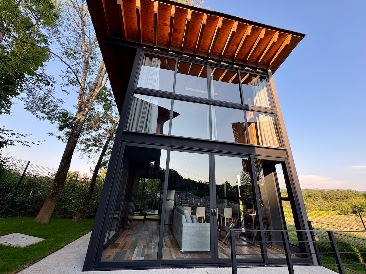 Casa armada con dos contenedores marítimos, diseñada con estilo contemporáneo y grandes ventanales para tener una experiencia en medio de un hermoso bosque de encinos y pinos propios de la zona. Ideal para desconectar de la ciudad, descansar, cocinar rico, pasar tiempo en familia y disfrutar noches de naturaleza. Este lugar es ideal si te gusta la naturaleza y la tranquilidad. No es ideal si buscas acceso súper fácil, llegar muy tarde o cero variaciones de servicios (como en ciudad).
