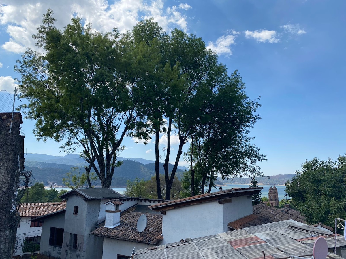 Casa con vista al lago y a las montañas, en medio del bosque, con un jardín propio de 5,000 m2, alberca privada con calefacción y gimnasio privado; ubicada en un fraccionamiento con seguridad las 24 hrs. Diseño arquitectónico en desniveles con techos altos a dos aguas, vigas y columnas de madera, teja roja, barro y madera. Decoración con elementos tradicionales de una casa mexicana contemporánea. Excepcionalmente iluminada con vistas al bosque y jardines desde cualquier ventana.