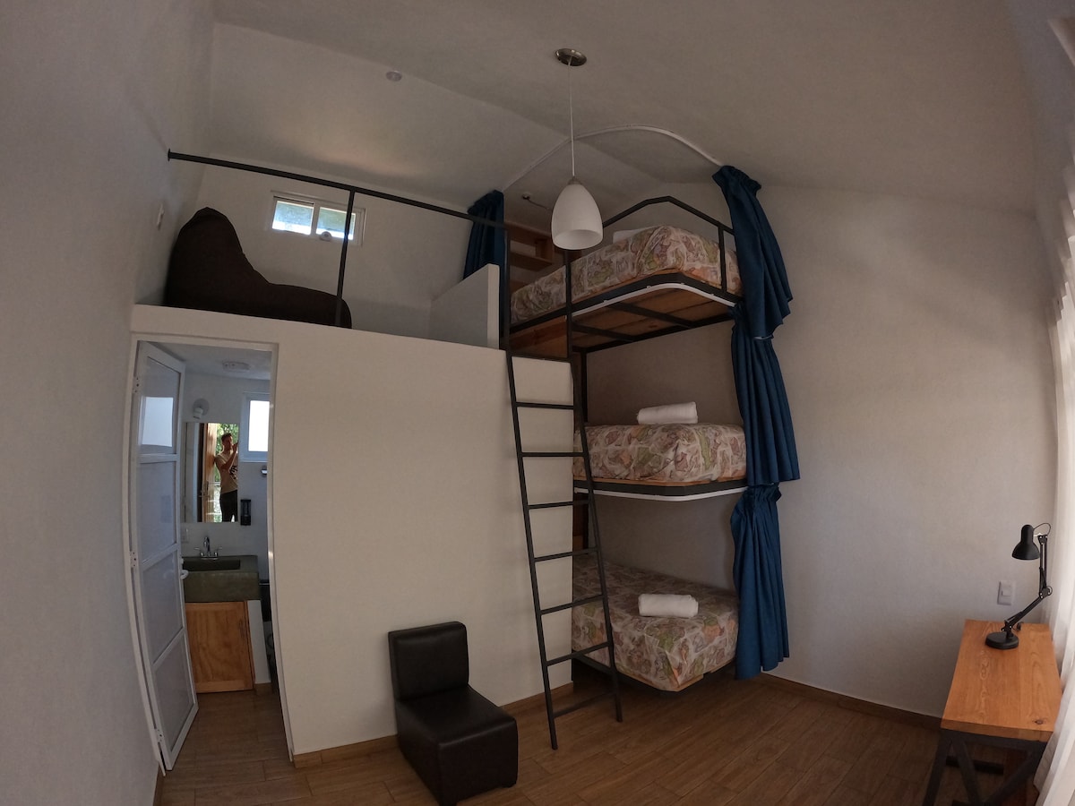 En Valle de Bravo, la pasas padrísimo y sí te hospedas con nosotros, aún más. Ubicado en la costera, tiene una vista a la peña muy bonita. El área social tiene mesitas con una terraza, alberca, jacuzzi, baños y regaderas. Si viajas en grupo, esta habitación es perfecta para ustedes. Cada cama es muy privada con su cortina y lámpara. Tiene un baño completo dentro de la habitación y un locker para cada persona. Y si disfrutas de actividades extremas, nosotros te facilitamos los contactos!