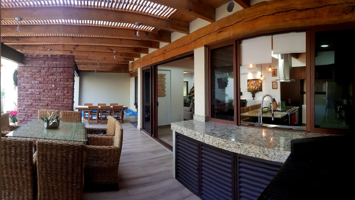 Nuestra casa es muy acogedora, está completamente equipada, te sentirás muy cómodo y relajado. La terraza es genial, con vista al lago, un asador de carbón y podrás relajarte en el jacuzzi. Está ubicada dentro de un condominio en el pueblo, con super mercados muy cercanos. La alberca y jardín es parte de las áreas comunes.