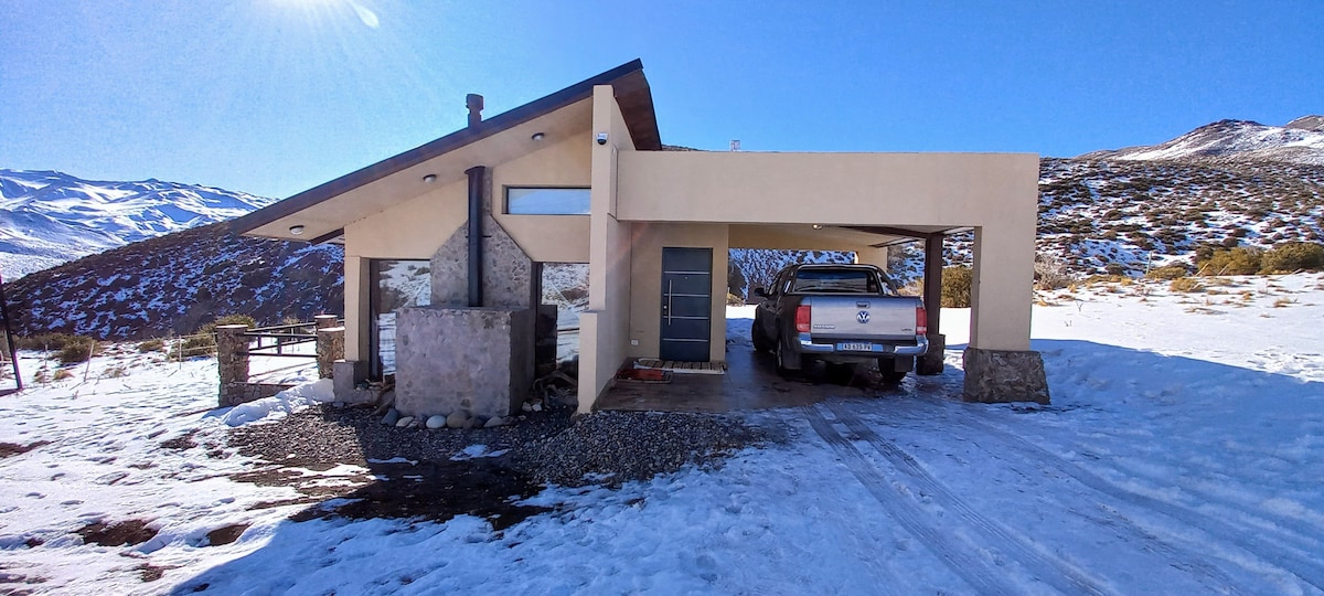 Cabaña de Montaña en barrio cerrado Piri-Hue, a 15' de Las Leñas. 8 pasajeros. Ambientes super amplios, techos en doble altura, con vistas esplendidas a las montañas. Electricidad de paneles solares y generador "Cabaña de Montaña" in "Piri-Hue gated community", just 15 minutes from the Las Leñas Ski slopes. 8 passengers. Super wide environments, double height ceilings, with windows with a dream view of the mountains. We generate and use solar