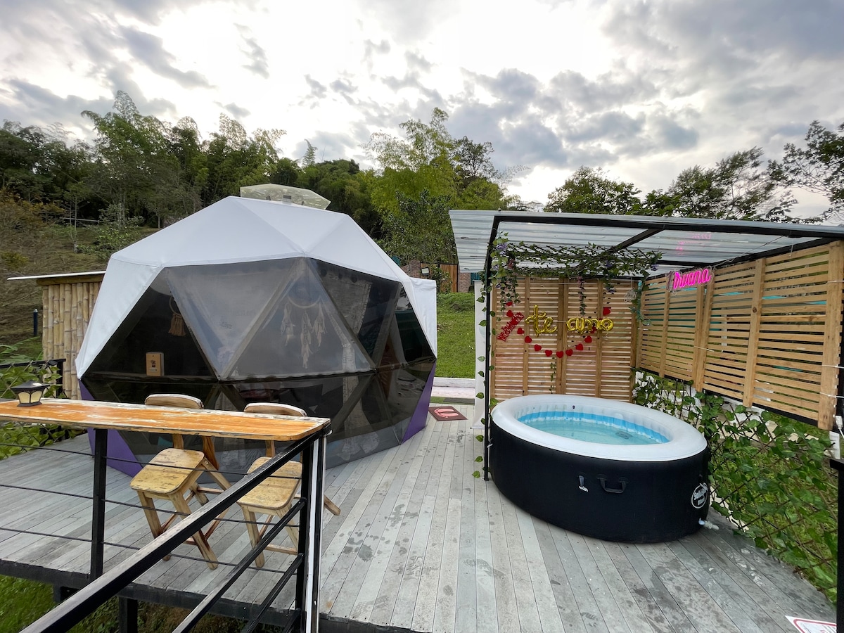 Eco domo fabricado en material reciclado, forma geodésica, con secciones en cristal que permiten disfrutar del paisaje cultural cafetero y techo en vidrio para ver las estrellas desde la comodidad de tu cama. Igualmente, puedes relajarte en un jacuzzy privado con 120 chorros de hidromasaje, junto a tu pareja y disfrutar del calor de una fogata en medio de la naturaleza.