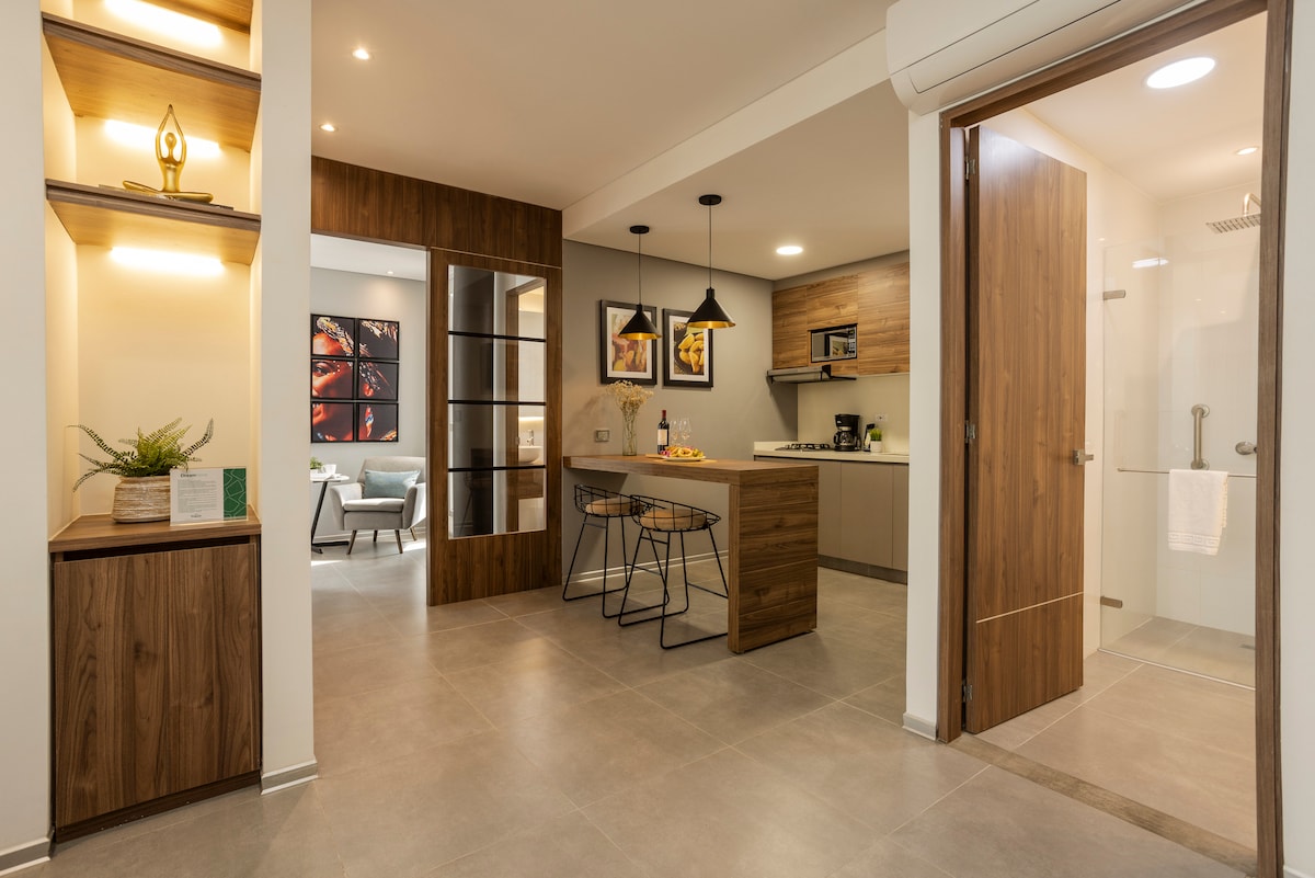 Granada 17.22 | Boutique Stays Enjoy Cali this 63mtr2 apartment in Granada, the best "Zona Rosa" (lively area). Modern and luxurious design offering 100% autonomous access, guaranteeing your privacy and security. AMENITIES: Equipped Kitchen Fiber Optic WiFi Desk A/C Smart TV Queen Bed Hot Water 2 Bathrooms Sofa Bed Ideal for couples, friends, or family. Immerse yourself in the cultural and gastronomic life, bars, and shops at hand. Just minutes from Boulevard del Río and La Ermita Church.