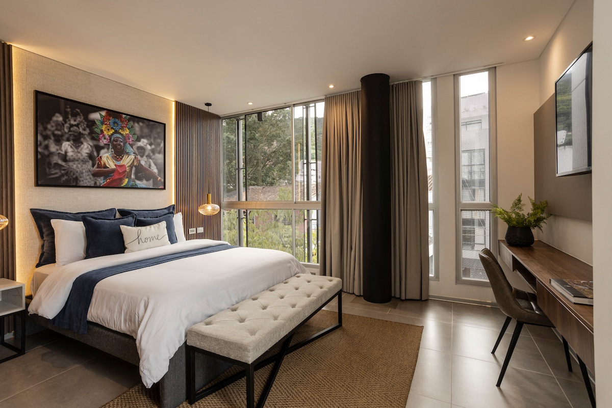 Modern apartment in Granada, Cali’s top cultural and gastronomic district. Located on the 4th floor of the elegant Hayedo Juanambú building, it offers comfort, a large balcony with city views, queen beds and AC in both rooms. Living room with sofa bed and ceiling fan. Two full bathrooms with hot water. Fully equipped kitchen, washer & dryer. High-speed Wi-Fi (300 Mbps), printer, 3 SMART TVs. Master bedroom includes walk-in closet, safe, and balcony access.