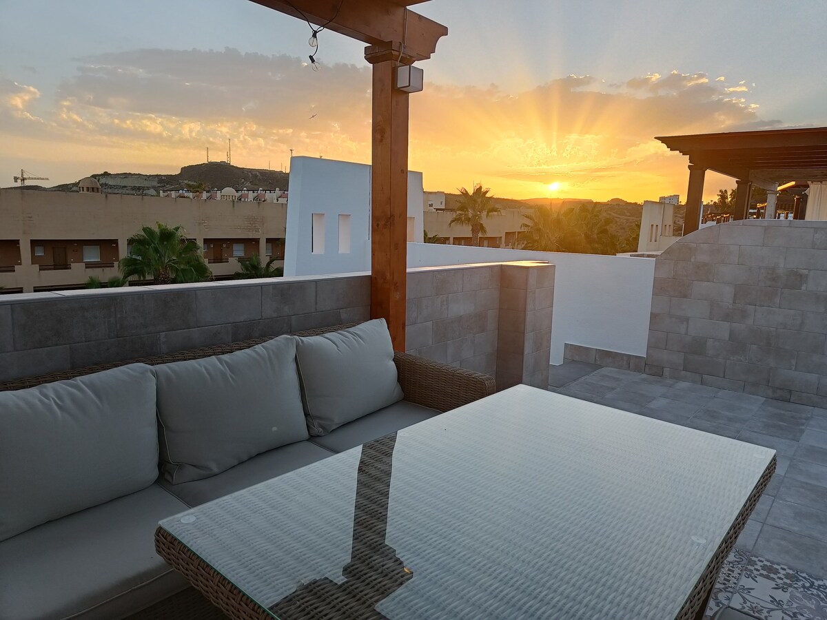 The perfect place to relax and enjoy. The apartment is located on top of a hill and a 5-10 min walk from te beach and the boulevard with all restaurants and bars. The air bnb has a huge terrace (70m2) with a roofed dining area, lounge and a barbecue. The views are spectacular. You will live between the mountains with a fantastic pool- and seaview. Inside we have all equipment and service you need. Mojácar and it's surroundings has a lot to offer.