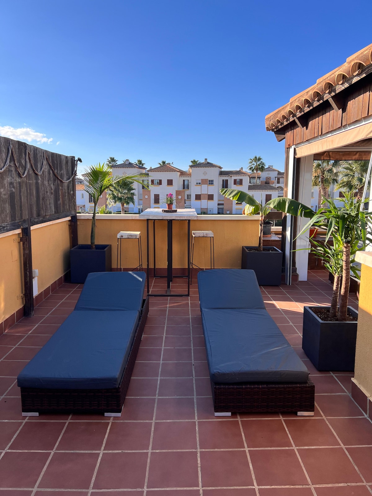 Cosy family flat, located in the Valle del Este golf resort. It has three spacious and bright bedrooms, two bathrooms, fully equipped kitchen, living room and a private garden. The garden is an ideal place to relax in the sun, play with the children or enjoy a barbecue. Our terrace overlooks the 1st hole of the golf course. The urbanisation has a swimming pool open all year round. Several exclusive restaurants within 5 minutes walking distance. Perfect for teleworking.