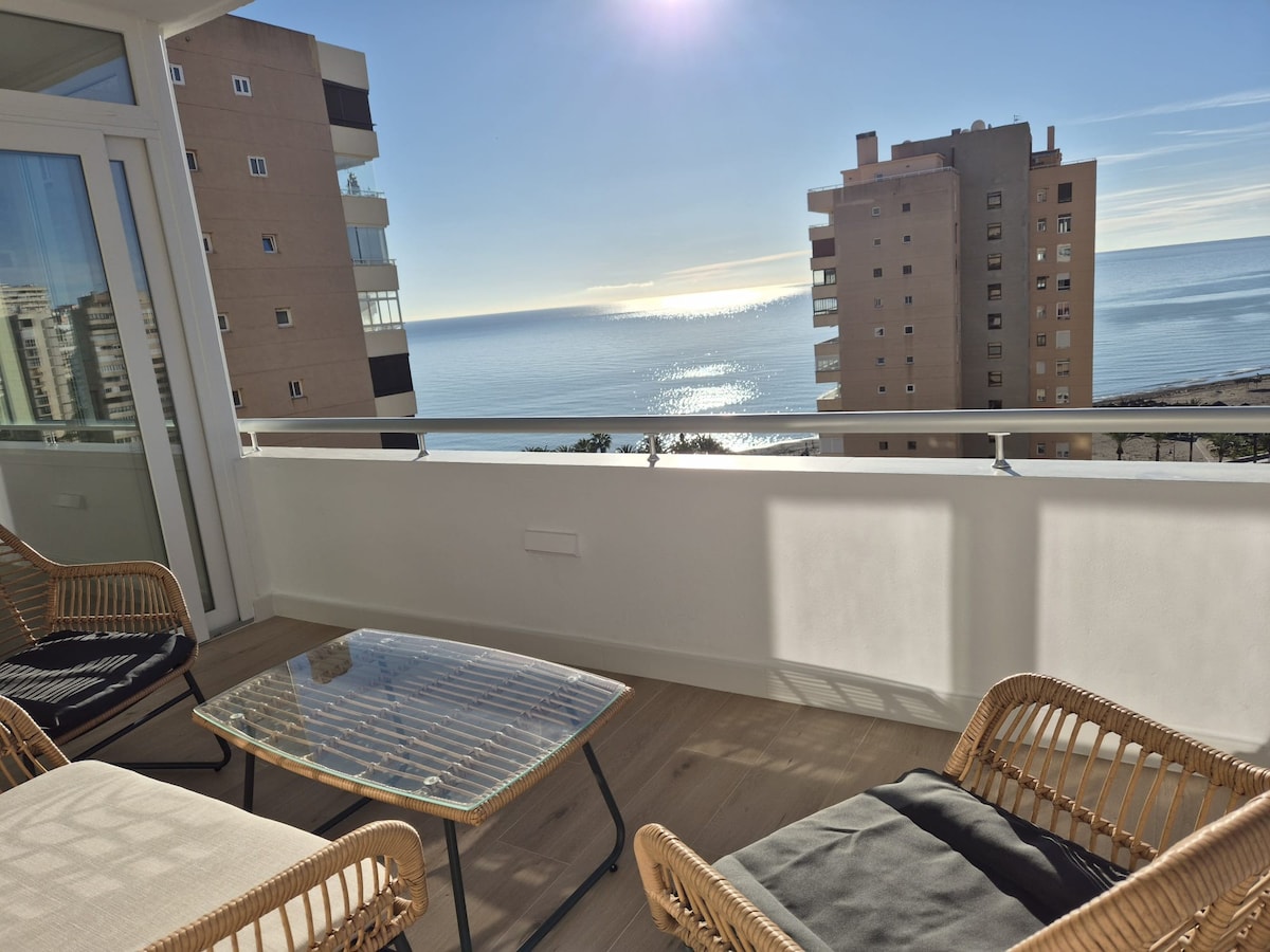 Spacious duplex with AMAZING SEA VIEWS, 100% refurbished with everything brand new. 2 bedrooms, one of them with King Size bed , 1 bathroom & a big living room with open kitchen. Nice terrace with espectacular views. 12 minutes away by walk from Carihuela Beach (3 min by car) and 15 minutes away from Málaga city. Excellent train connections with Malaga Airport and AVE Station (stop: Montemar Alto). Quiet area with nice gardens and swimming pool.