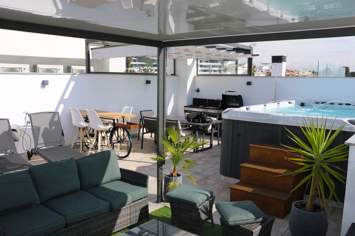 Brand New! A beautiful luxury penthouse located in the stunning village of Mijas Pueblo. * The Best Ocean & Mountain views that the Costa del Sol has to offer * Relax on your own private roof terrace including a hot tub, day bed & sunloungers. Both the roof top terrace and the dining terrace is a great space for entertaining, relaxing & enjoying the amazing sunset and views The penthouse has a luxury décor with open plan living, both bedrooms have sea views & comfortably sleeps 4 people