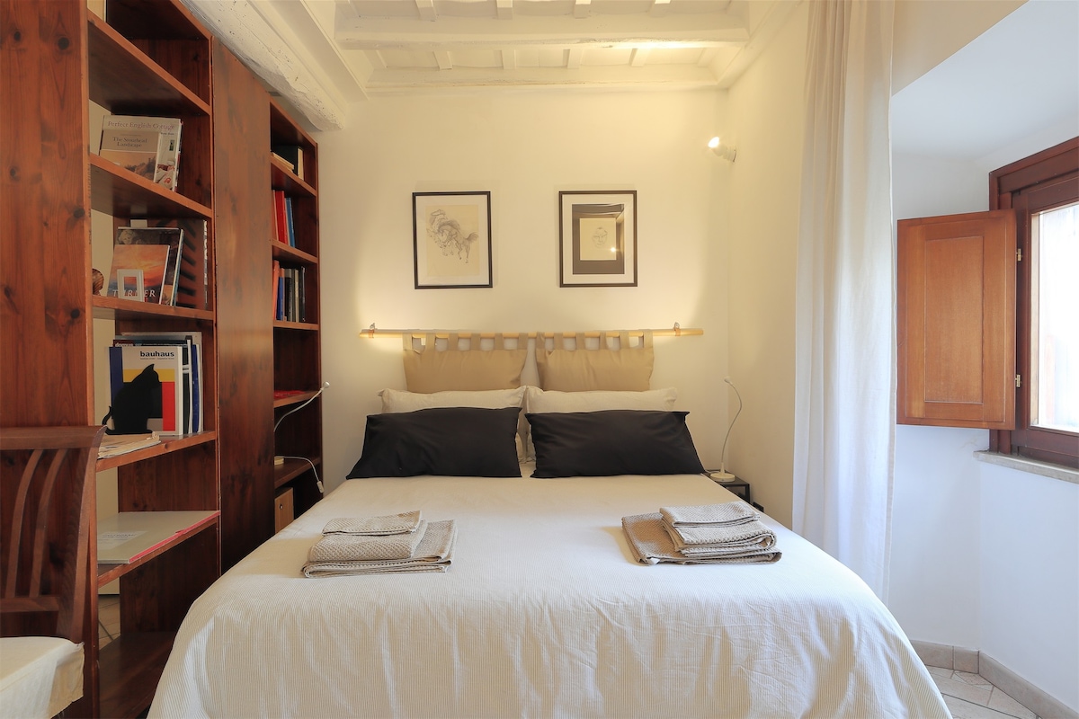 Bright and quiet penthouse apartment in the heart of Trastevere, with a wonderful terrace and an unparalleled view of charming roman roofs and the Gianicolo hill. The flat is meticulously refurbished and set in a picturesque cobblestoned street, just around the corner from the lively restaurants and cafes. La Casetta al Mattonato is located on the 3rd floor (41 steps, no elevator) of a 1600s typical roman building, within walking distance of all major attractions.