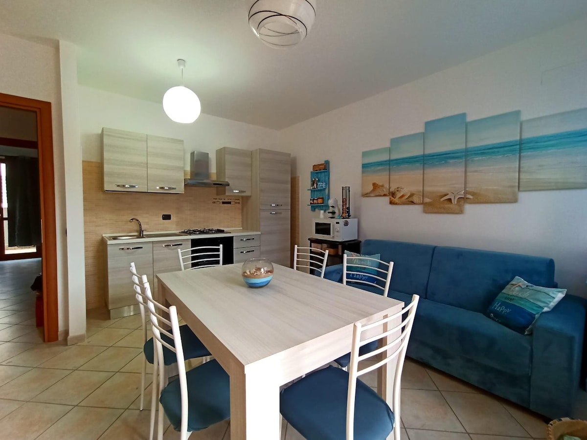 Bilocale per 4 persone, in residence a 50 mt dal mare e dallaspiaggia di Baia delle Mimose. Piano terra con 2 resede privati per pranzi all'aperto, barbecue, doccia esterna. 1 camera da letto , cucina/soggiorno e divano letto doppio , bagno con doccia. Non c è biancheria da letto e da bagno, possibile noleggio previa comunicazione.(€25 lenzuola,€10kit bagno a persona) Lavatrice, aria condiz.,phon, forno elettrico, frigo con freezer, TV, posto auto Pulizie finali €85 in contanti all arrivo.