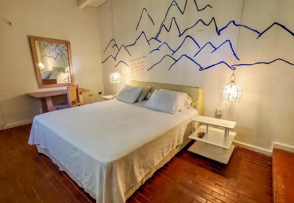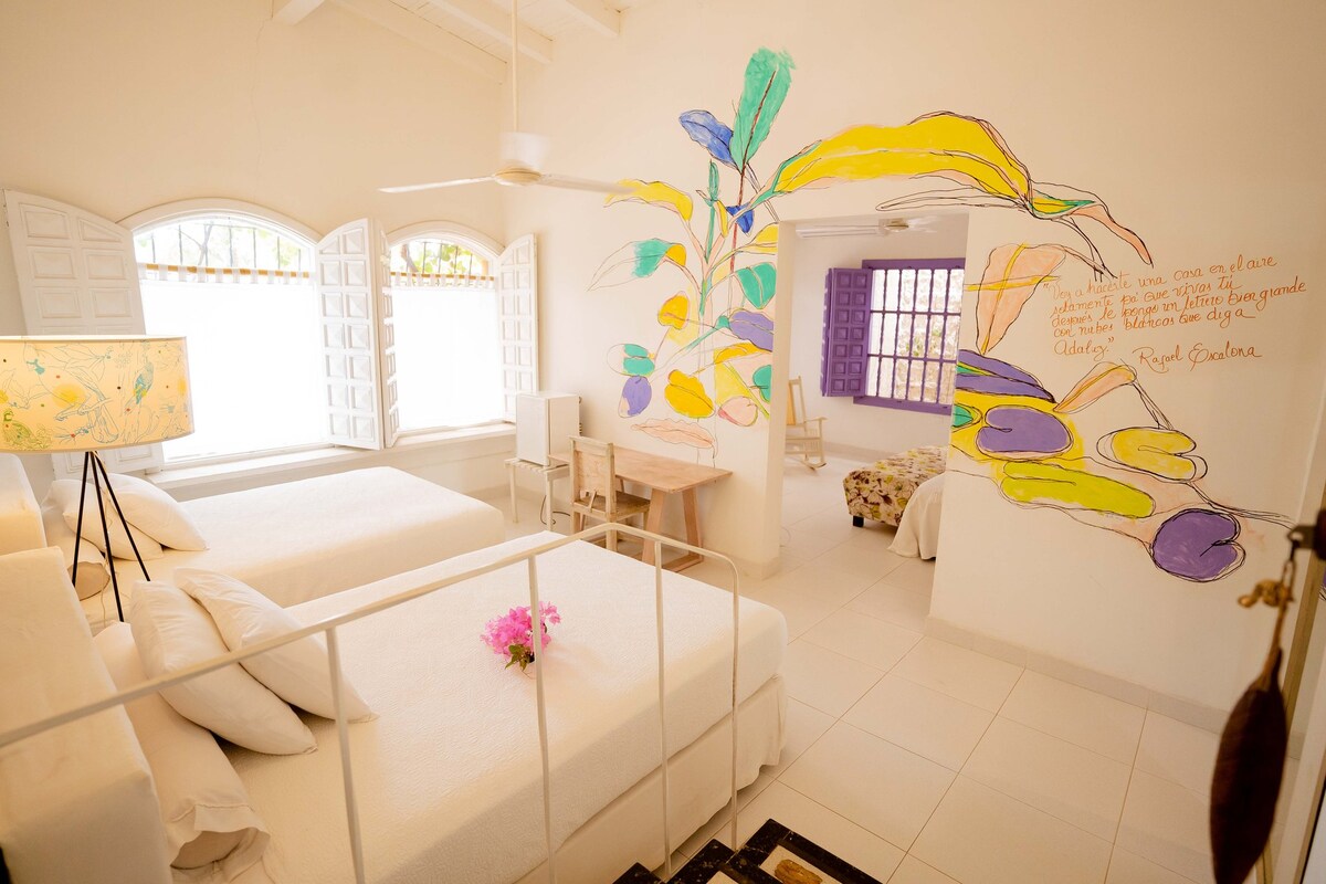 La habitación El Cielo, construida en el 2016, se encuentra en el segundo piso y a través de sus amplias ventanas permite disfrutar la vista de palmeras, el estallido de color de las trinitarias y la cumbre del Cerro Murillo que parece cantarle una serenata de amor al cielo de Valledupar. El artista Celso Castro dibujó una bella obra con colores y flores en una de las paredes y en el baño.