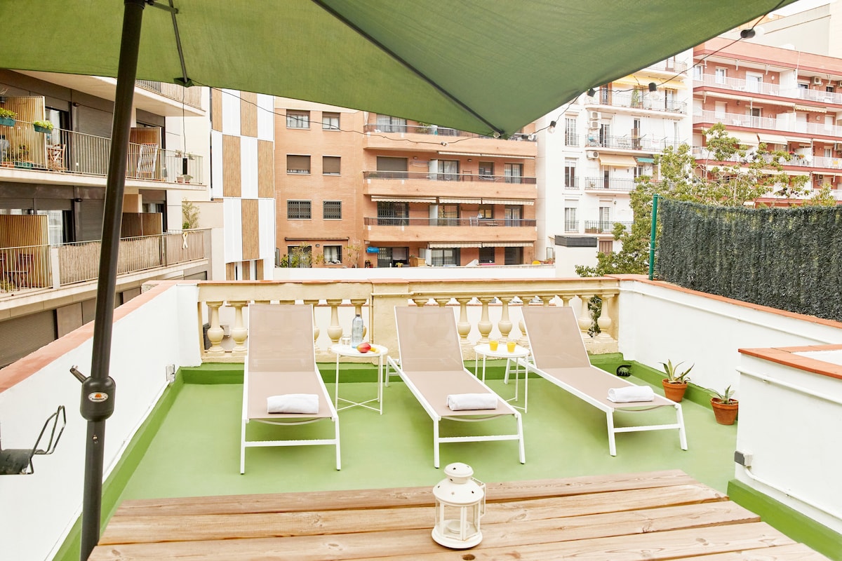 Spacious and bright 180 sqm (1938 sqft) terraced house near FC Barcelona Stadium. 5 bedrooms in 3 different floors. Large living room with 2 different spaces, comfortable sofas, dining table and LED TV. Fully equipped kitchen. 3 bathrooms. 2 terraces.