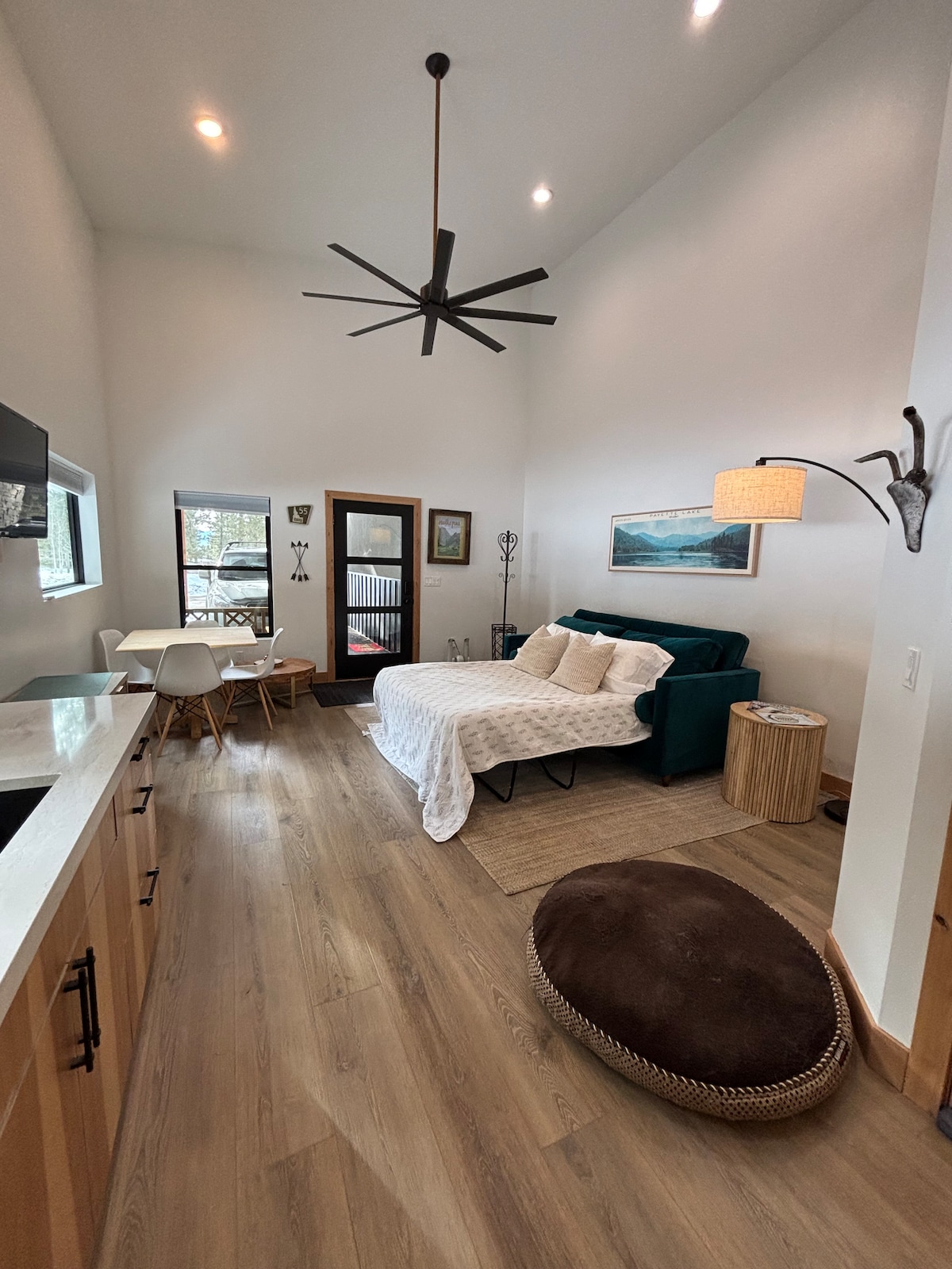 Calling all outdoorsy adventurers! Enjoy a peaceful mountain stay just minutes from downtown McCall & Payette Lake. This private, pet-friendly ground-floor studio is attached to the garage of the owners’ primary residence and has a separate exterior entrance and covered parking. Ideal for easygoing couples seeking a clean, comfortable, no-frills place after skiing, biking, or lake days. Queen sofa sleeper, TV and kitchenette. Best for independent, respectful, low-maintenance guests.