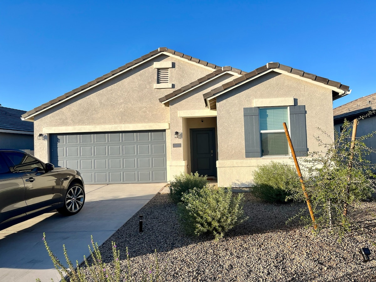 Take a break and unwind at this peaceful home in the beautiful desert. About 55 miles from Phoenix Airport and 80 miles from Tucson Airport. Walking pathways, parks, golf course, soccer fields, grocery store, gas station and restaurants are very close by. Enjoy amazing sunsets and warm weather. Stays over 30 days can have access to the recreation center, pools, tennis courts, gym, tennis courts, indoor basketball courts and various other amenities.