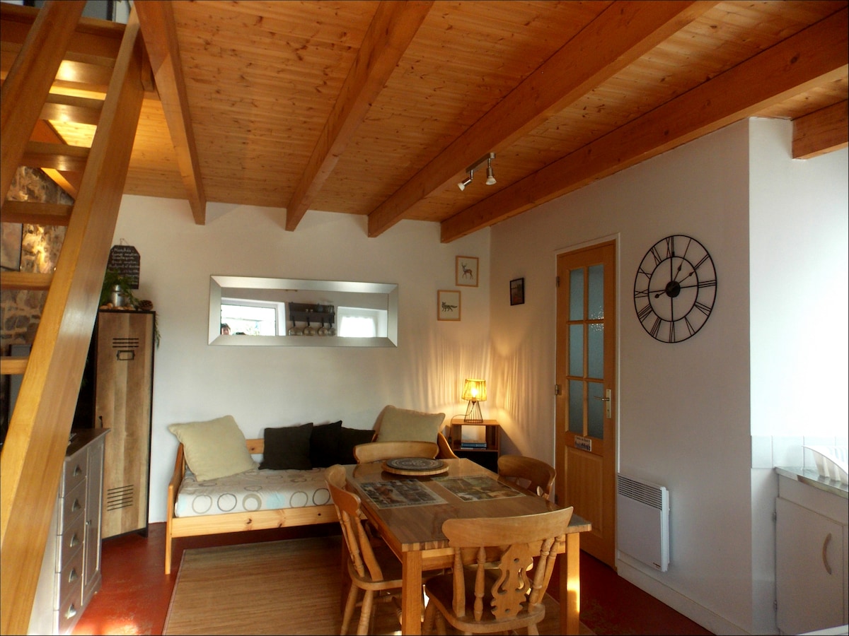 You will appreciate the cocooning atmosphere of this small house. The house consists of an entrance airlock, a living room with a kitchen area, a showeroom, upstairs: a bedroom with a large double bed 160 cm x 200 cm bed. The whole overlooks a small courtyard furnished with a garden furniture and a barbecue in summer...