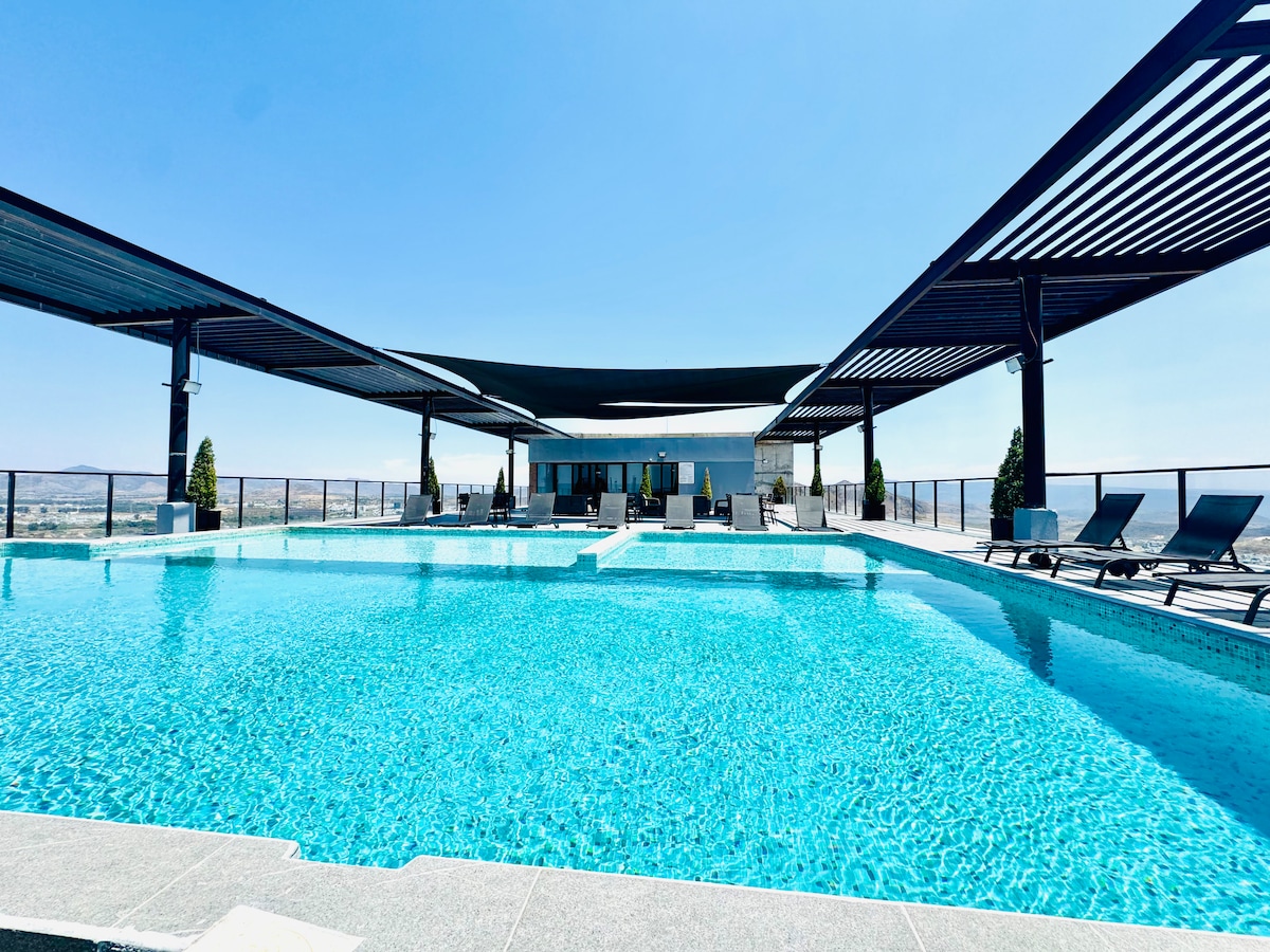 -Un Penthouse con una vista y ubicación privilegiada. -Muy cerca del centro Histórico de Guadalajara y de fácil acceso, estacionamiento priv. -Cuenta con Terraza y Jacuzzi privado al aire libre. Podrás tener un tranquilo y gratificante alojamiento con nosotros, ubicado en el nivel 9 a un costado del elevador en una torre de apartamentos exclusivos, con cómodas instalaciones y acogedores ambientes diseñados para que vivas una experiencia increíble! Será un gusto poder recibirte con nosotros.