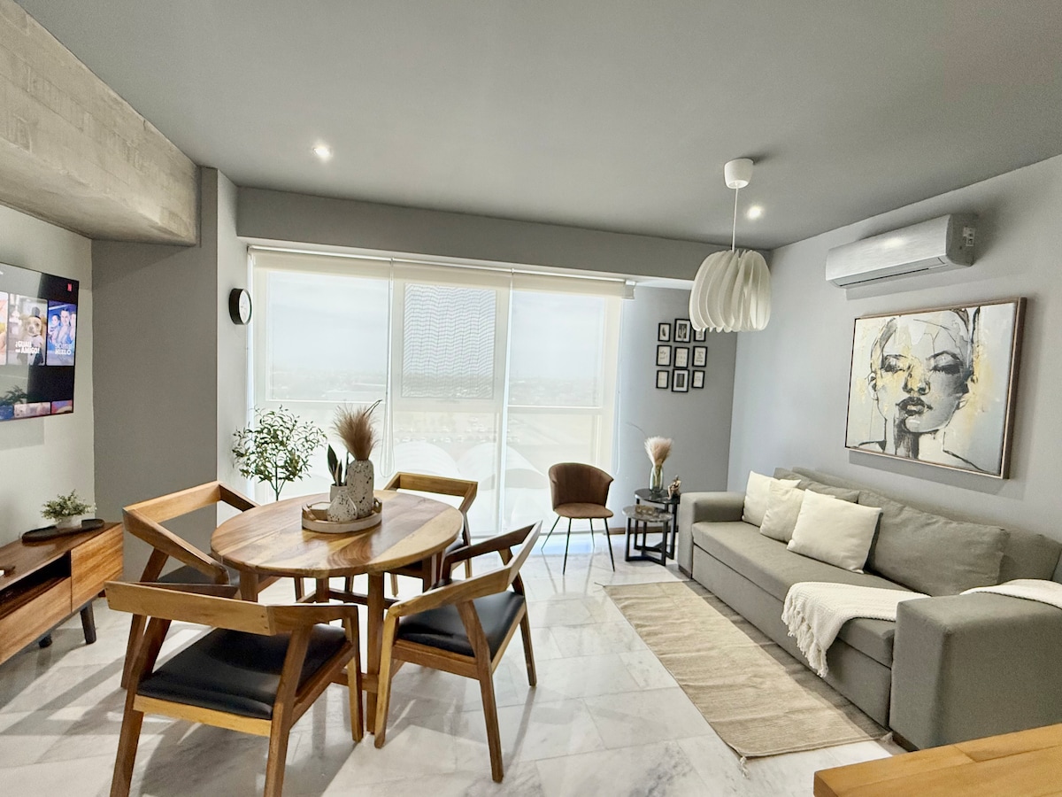 Departamento amueblado de lujo, completamente nuevo , 2 recámaras, área de lavado, cocina equipa, una Terraza para disfrutar una Linda tarde a escasos metros de la alberca, cuantas con 2 cajones de estacionamiento, el condominio tiene acceso directo a la plaza comercial (Real Center) donde puedes encontrar restaurantes, Cinepolis, Starbucks, lavandería y súper mercado Sam’s . Tienes acceso al gym, alberca , salón de juegos y cuentas con seguridad 24/7. Podemos facturar.