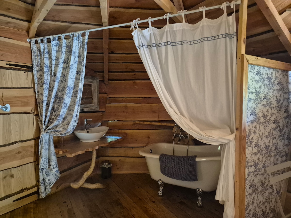 Hébergement insolite pour amoureux de la nature, en Sud Ardèche à Lablachère, à 10 min des gorges du Chassezac, des Vans (15 min) et de Vallon Pont d'Arc (20 min). Sur un terrain privé de 7000m2 composé d'un petit bois de frênes, venez vivre une expérience Glamping (alliance du Glamour et du Camping) dans cette cabane insolite nichée dans la nature et jouxtée d'un chalet Cuisine / salle de bain et toilettes sèches, le tout avec une décoration Bohême chic.