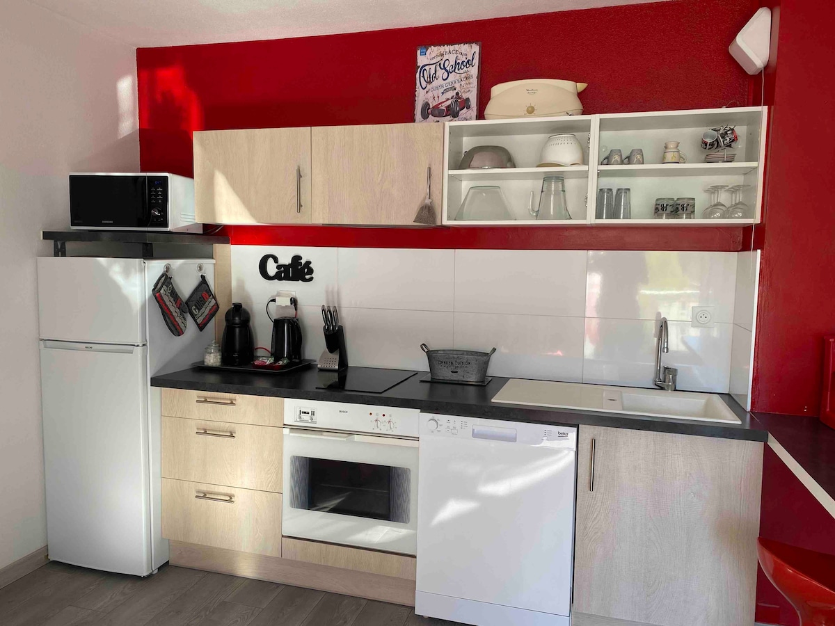 Meublé de tourisme classé 4 * : 65m2 dans écrin de verdure. La terrasse privative donne sur une forêt de chênes et de pins avec vue sur les collines. Une chambre avec un grand lit (qualité hotellerie) et une salle de bain attenante + une cuisine ouverte toute équipée et donnant sur un salon avec 2 banquettes-lits simples. Équipement complet, piscine partagée avec les propriétaires Nous serons ravis d’échanger sur les bonnes adresses de la région si les voyageurs le souhaitent.