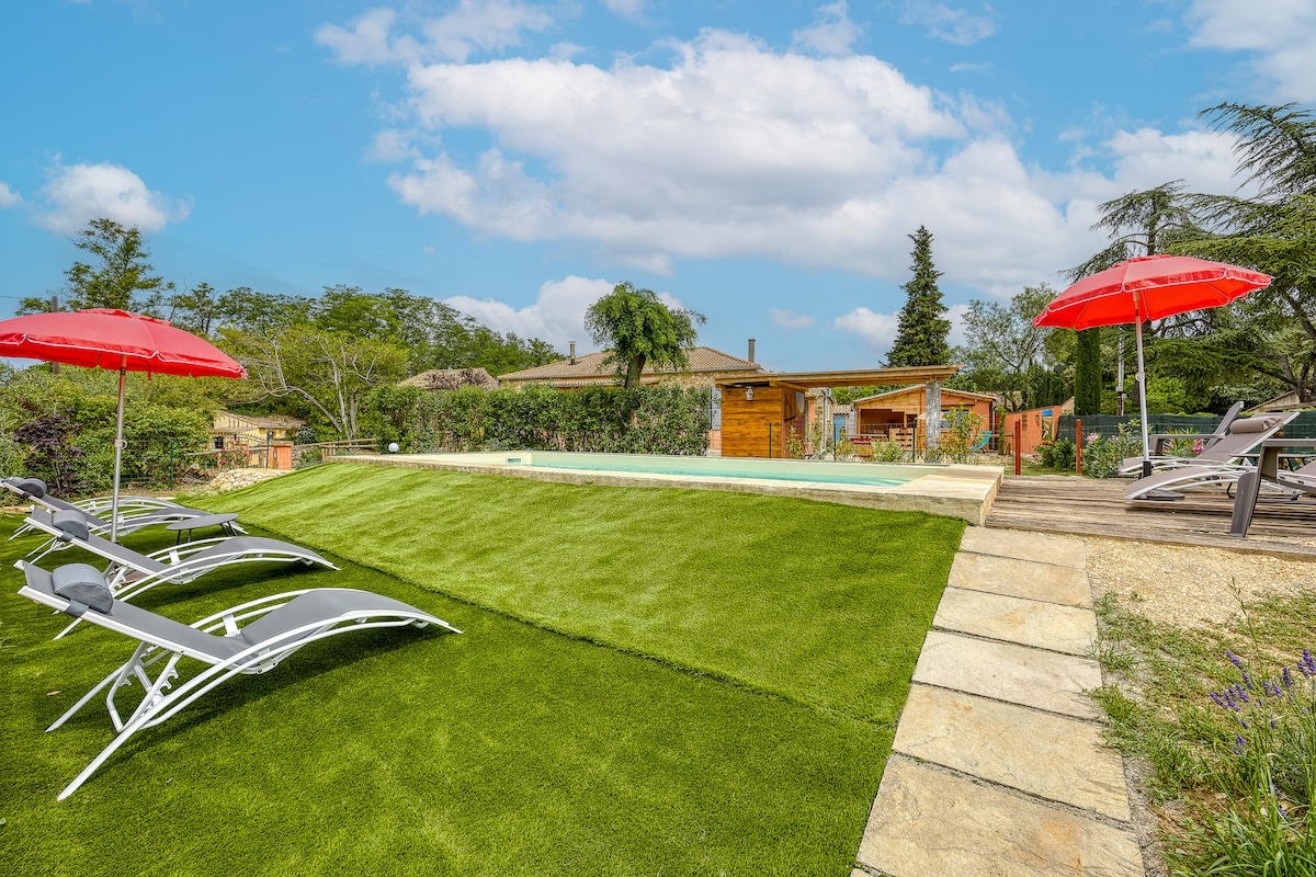 Situé en Ardèche Méridionale, dans un environnement naturel et calme, ce cottage de conception écologique peut accueillir 4 personnes. Cosy et décoré avec soin, il comprend 2 chambres dont une avec un lit queen size et l'autre avec deux lits simples. Sa cuisine est équipée (frigo, lave-vaisselle, lave linge, four micro-ondes, grille pain, cafetière expresso MALONGO). La grande piscine est partagée avec les 3 autres cottages de ce petit domaine de vacance. Lit BB et chaise haute sur demande.